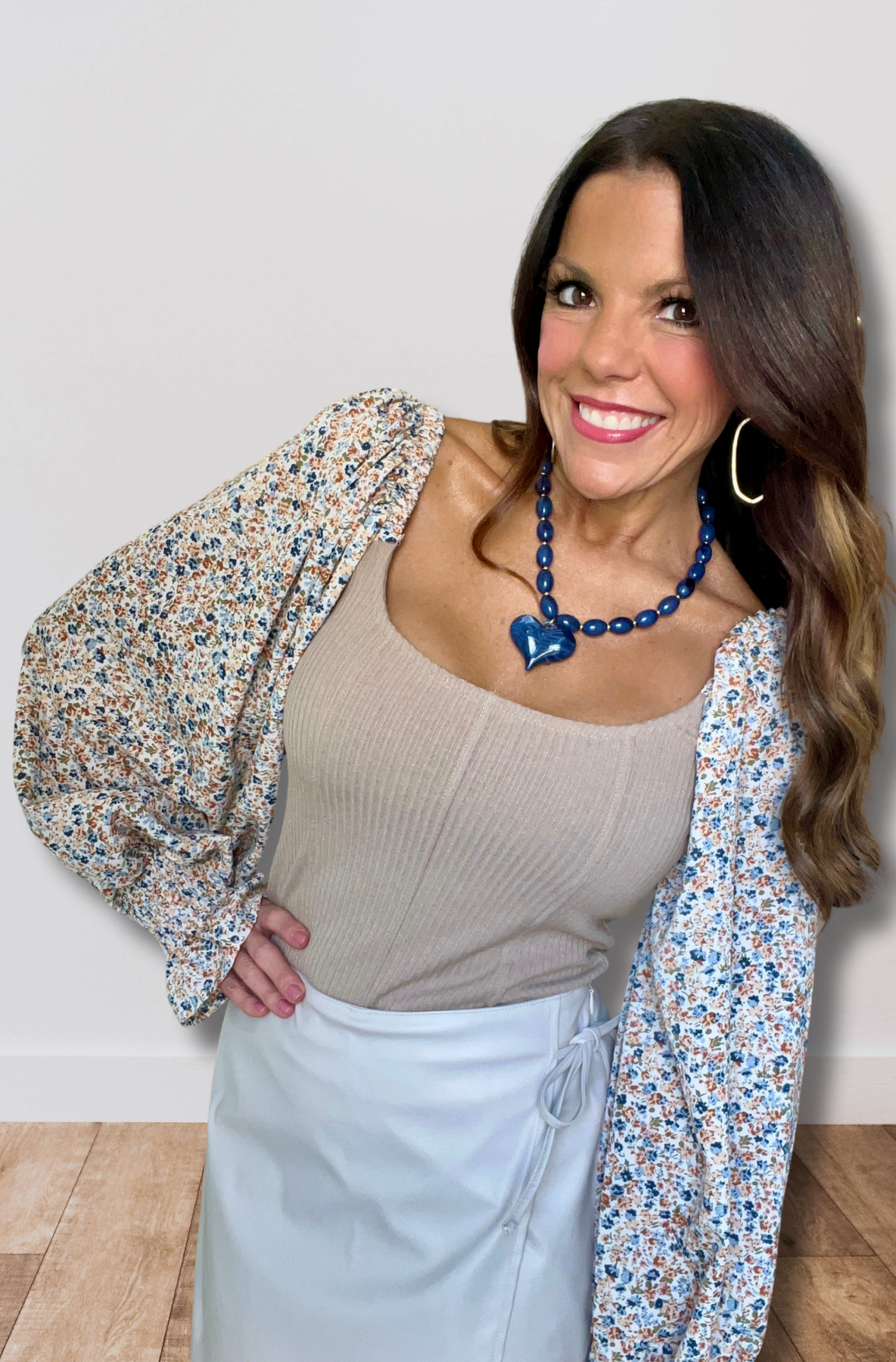 Regular price $69.00Romantic and effortlessly chic, the Miranda Bodysuit brings a touch of elegance to your everyday look. Featuring billowy white sleeves with a soft blue floral print and elastic cuffs, this beige bodysuit perfectly blends structure and femininity. Pair it with denim or a sleek skirt for a look that’s polished yet playful. We love it with our Faux Real Faux Leather Skort in Ecru and our Roxie Necklace in Blue!