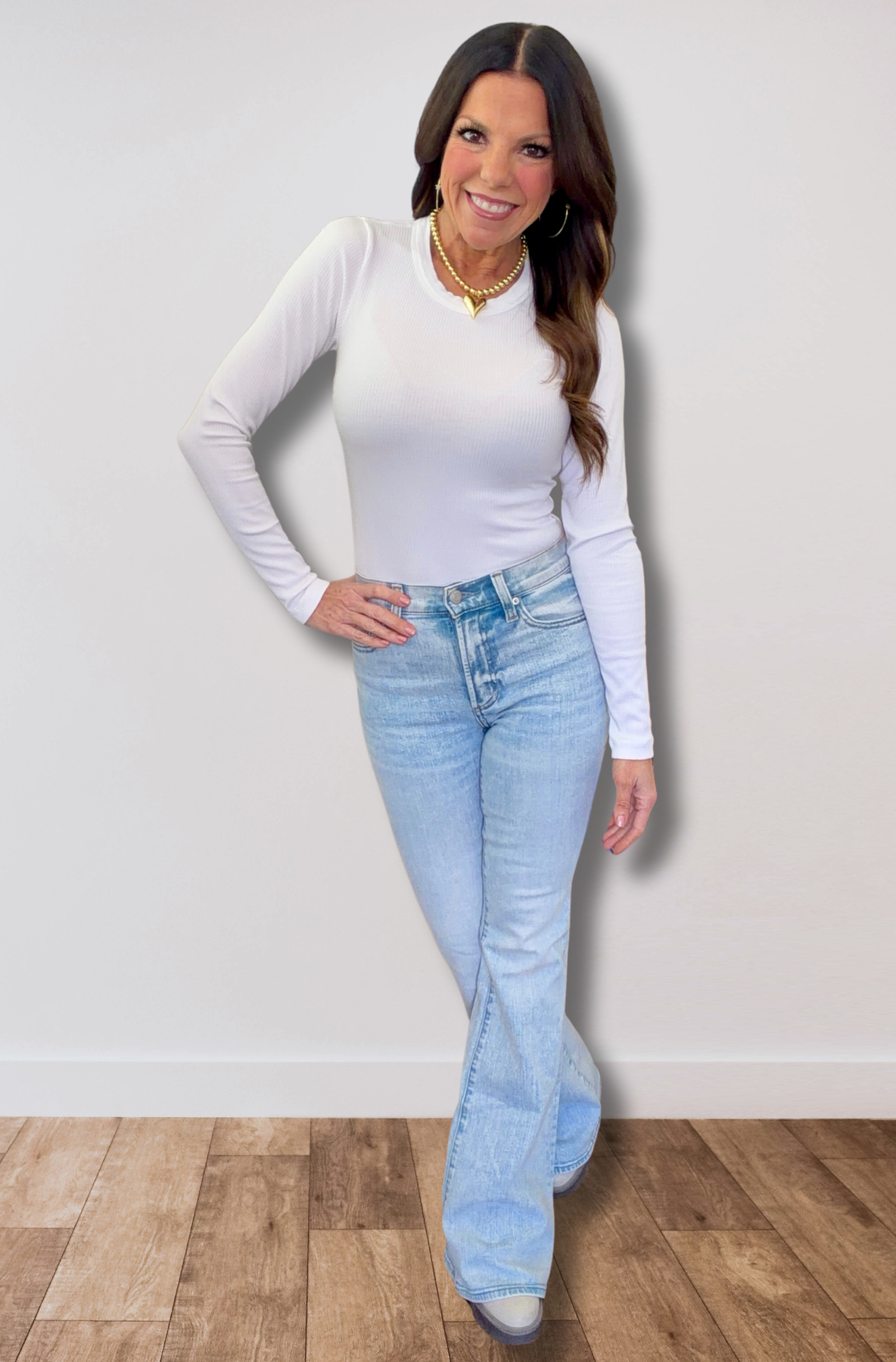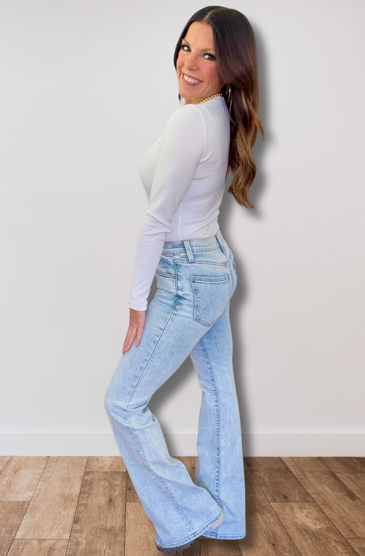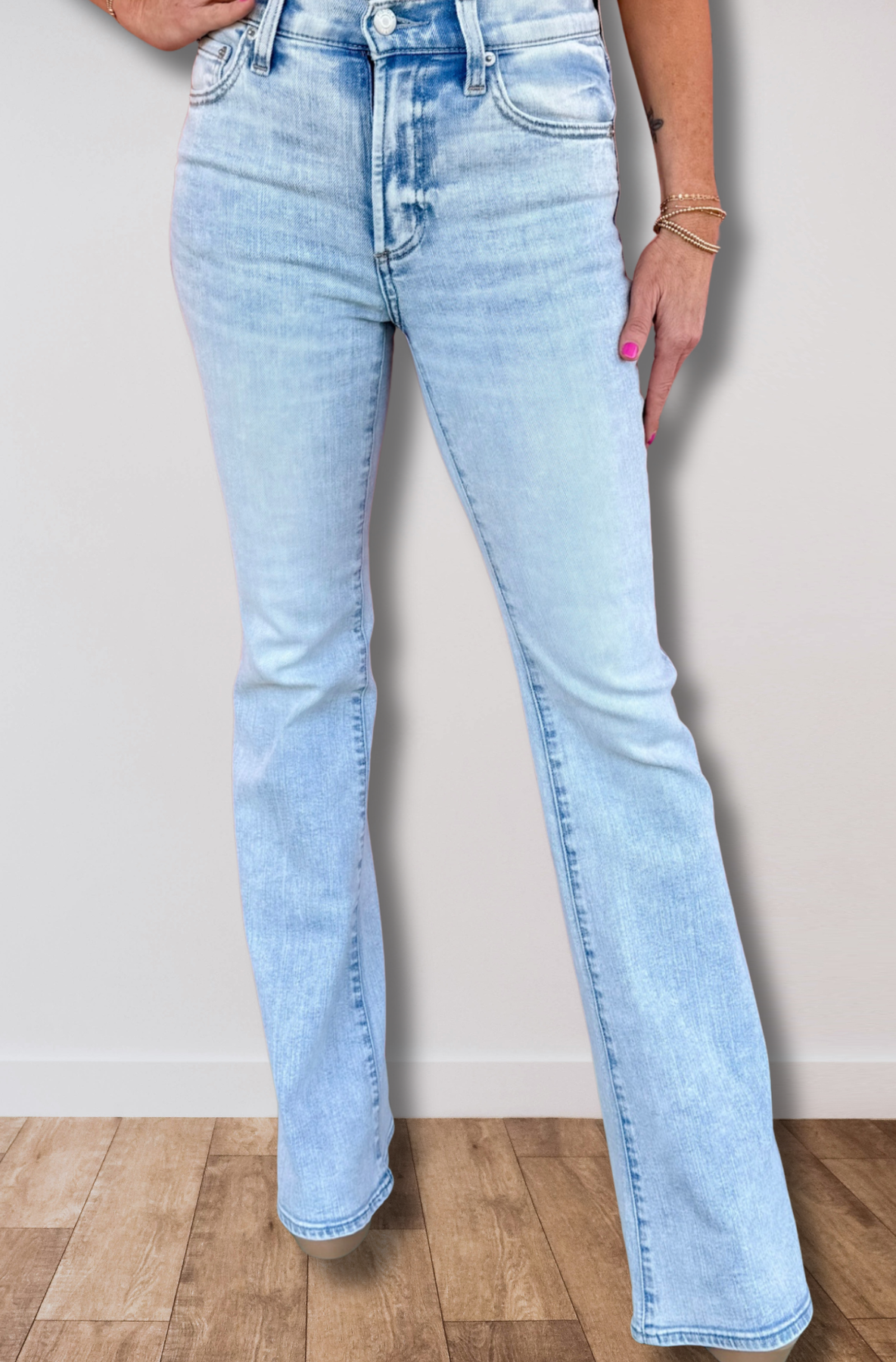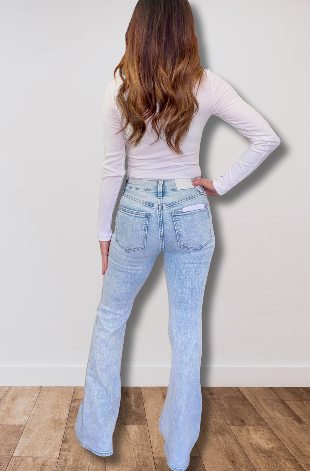 Mid rise waist with a sophisticated ultra-flared leg opening for unquestionably slimming proportions. Crafted from our signature comfort stretch denim. Serenity is a light wash.