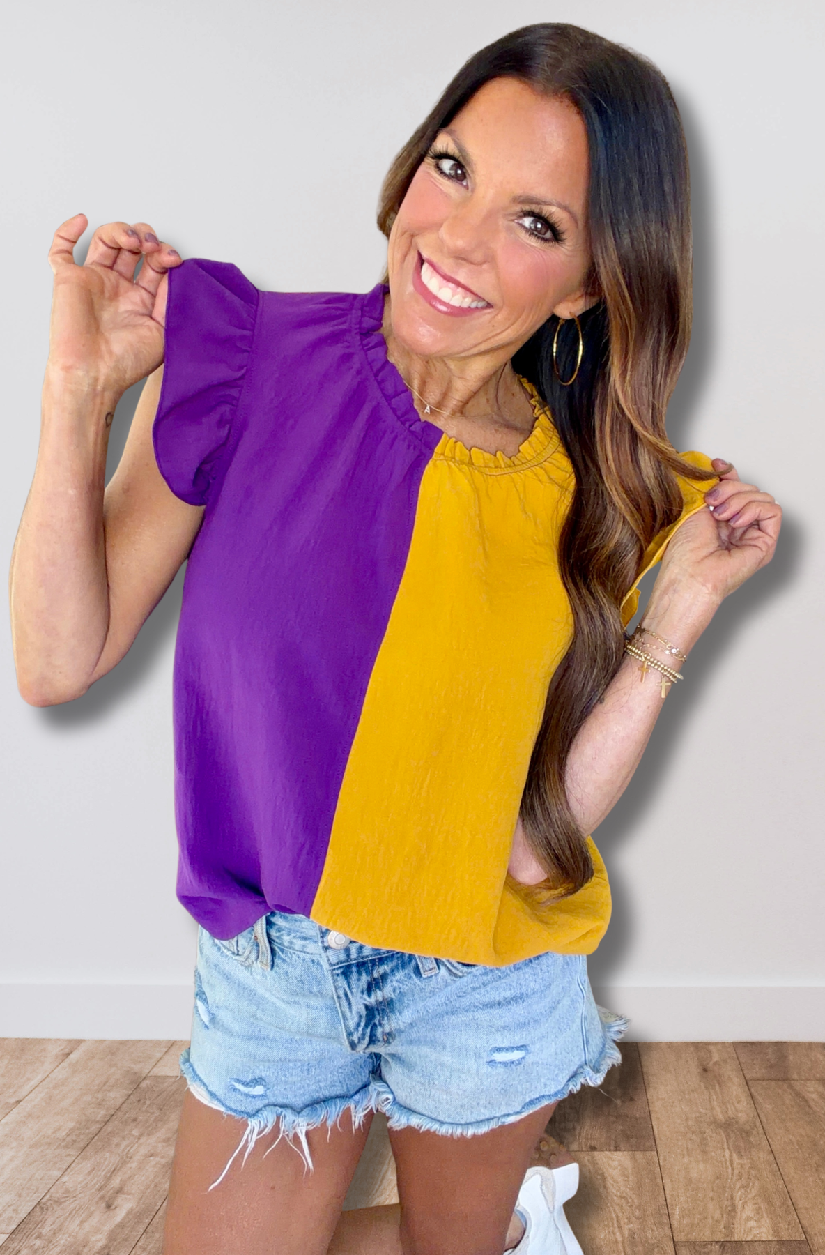 Regular price $38.00Cheer on your team in style with the Victory Color Block Gameday Top! This lightweight, easy-to-wear top features a bold two-tone color block design that’s perfect for repping your team colors. The flirty flutter sleeves add a feminine touch, while the breezy fit keeps you comfortable from tailgate to kickoff. Pair it with your favorite denim or a gameday skirt for a cute and effortless stadium-ready look. 🏈✨
