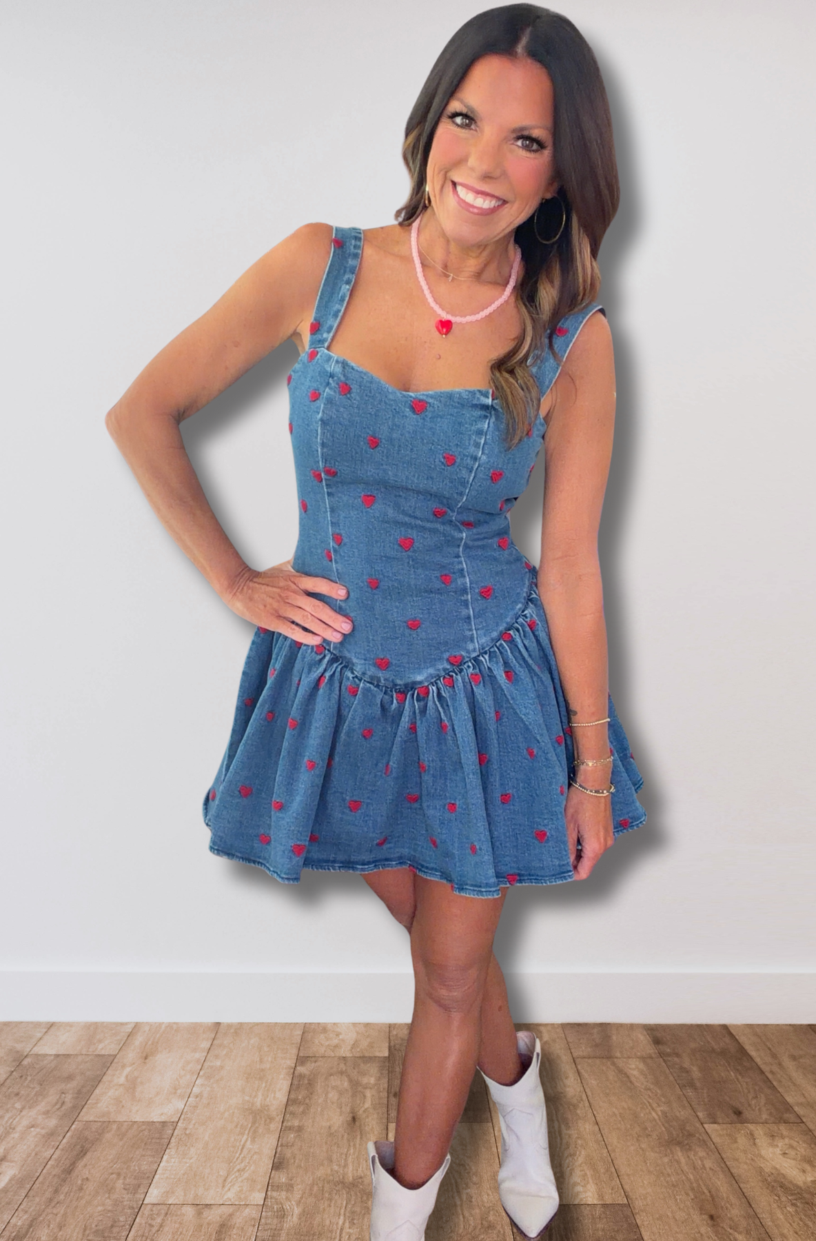 Playful, sweet, and irresistibly flirty, this heart-embroidered denim mini dress brings a romantic twist to an everyday classic. The sculpted sweetheart bodice and twirl-ready skirt make it perfect for date nights, weekend adventures, and getaway outings where you want to feel effortlessly cute and confident. Complete with hidden shorts!