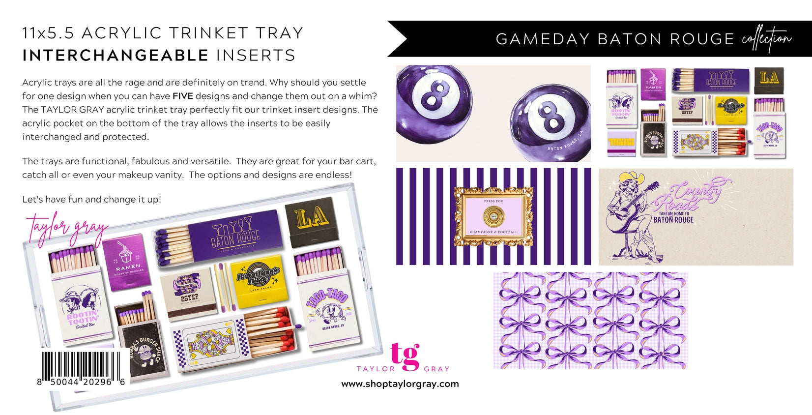 Baton Rouge how we love you! This gameday insert set is a nod to the ultimate college town, BATON ROUGE! The fun eight balls, coquette bows, cowgirl, vintage matches and press for champagne designs are sure to make the perfect dorm statement.