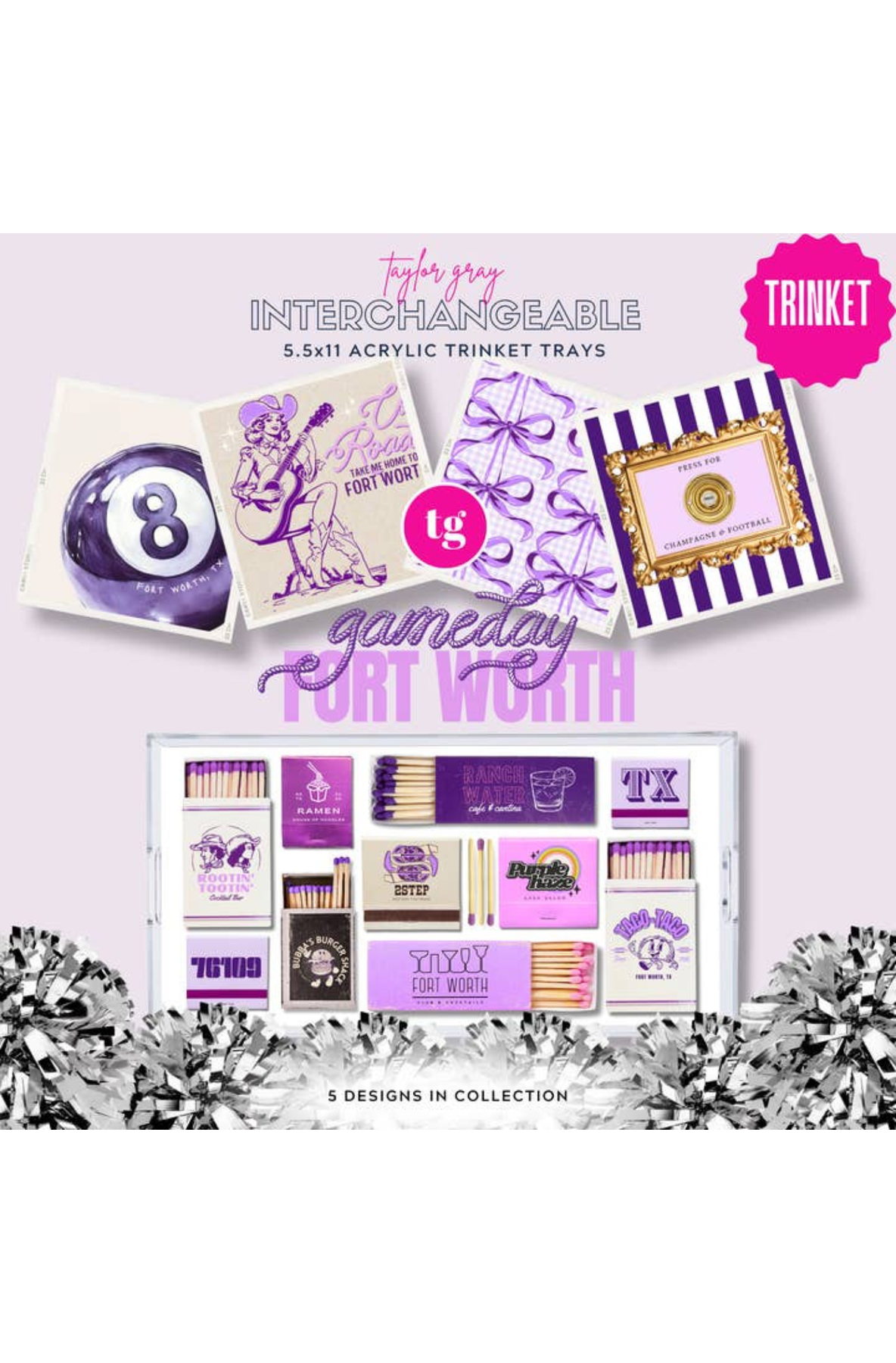 Fort Worth how we love you! This gameday insert set is a nod to the ultimate college town, FORT WORTH! The fun eight balls, coquette bows, cowgirl, vintage matches and press for champagne designs are sure to make the perfect dorm statement.