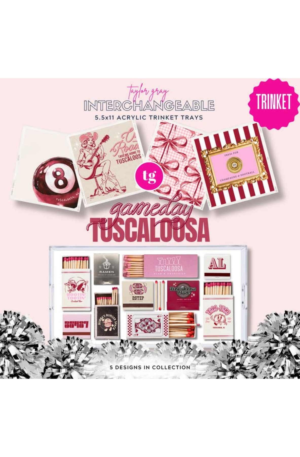 Tuscaloosa how we love you! This gameday insert set is a nod to the ultimate college town, TUSCALOOSA! The fun eight balls, coquette bows, cowgirl, vintage matches and press for champagne designs are sure to make the perfect dorm statement.