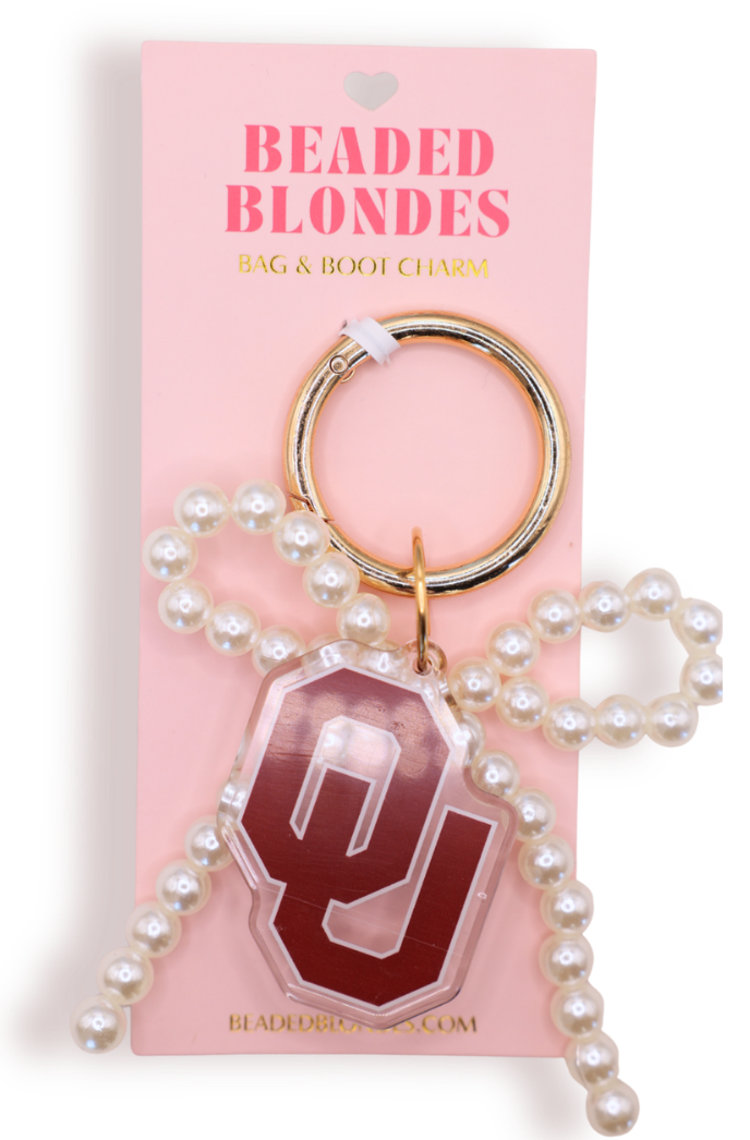 Regular price $28.00Dress up your bag or boot with this Oklahoma logo charm + our iconic pearl bow! This easily clips onto your purse, backpack, or boot for a spirited finishing touch! Just darling! This also makes the PERFECT graduation gift!