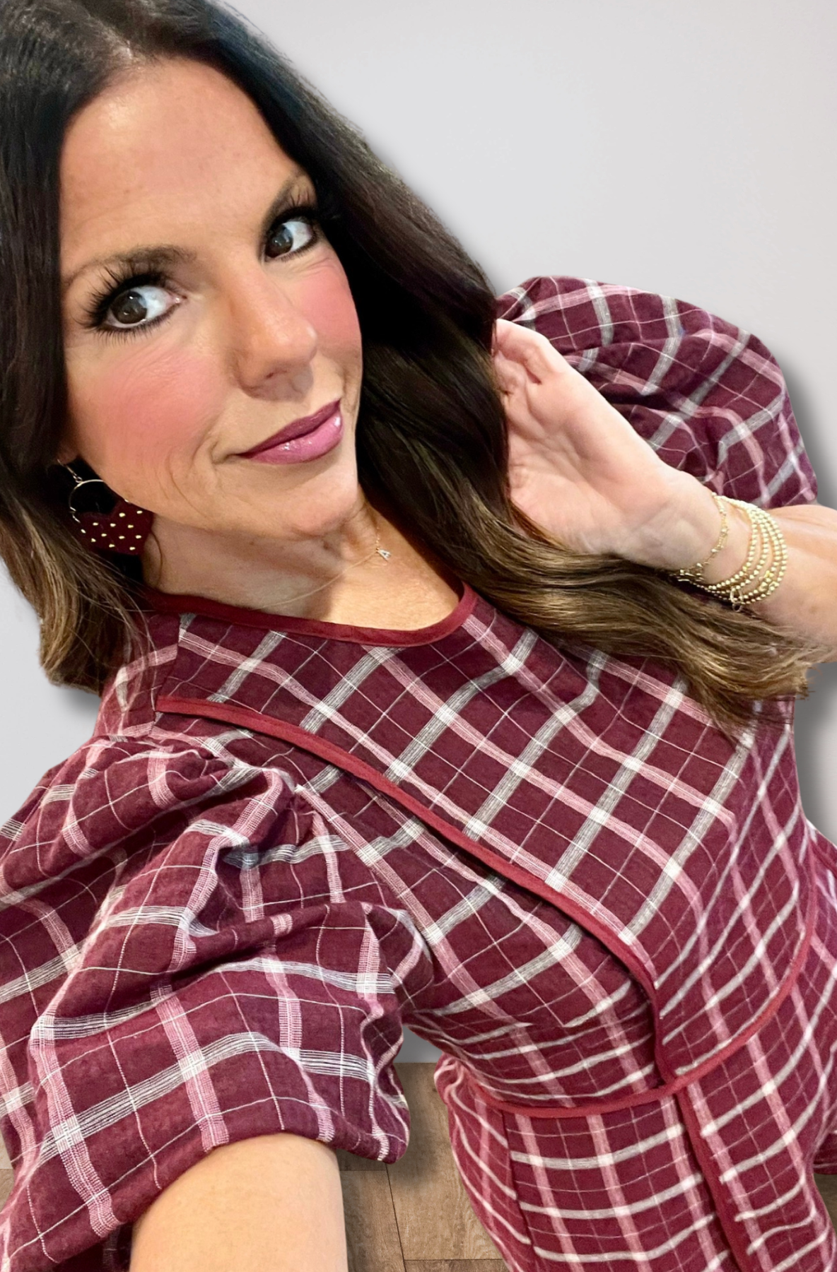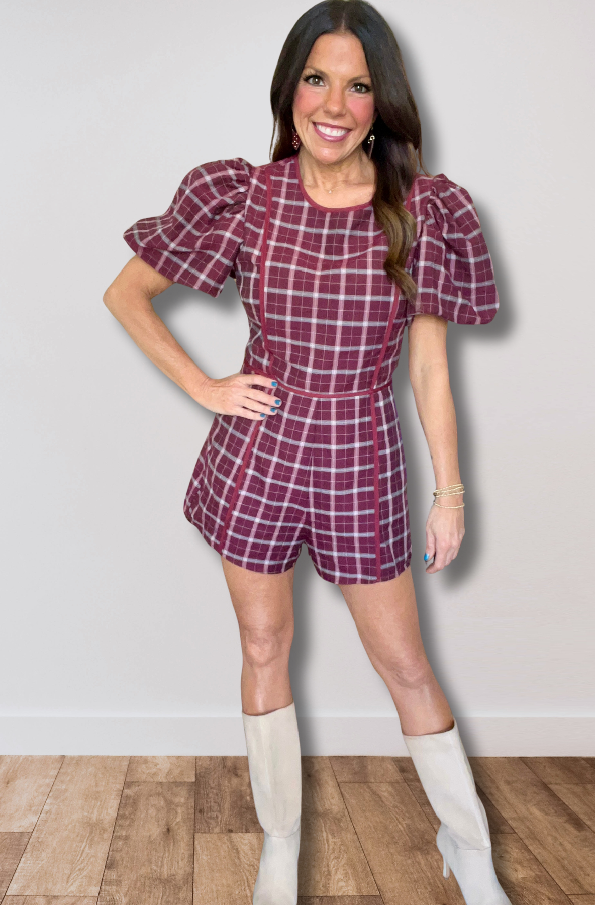 Celebrate the season in style with the Wren Romper in a fun burgundy plaid!   Featuring festive plaid, playful puff sleeves, and contrast bindings, this romper brings cheerful charm to holiday parties, family gatherings, or winter weekend outings. Lightweight and breathable, it’s designed for effortless comfort while keeping your look polished and picture-perfect. Pair with boots, tights, or a statement coat for a complete holiday-ready outfit.  We also love it for Maroon Gameday!  And our Burgundy Harlow earrings make the perfect finishing touch!