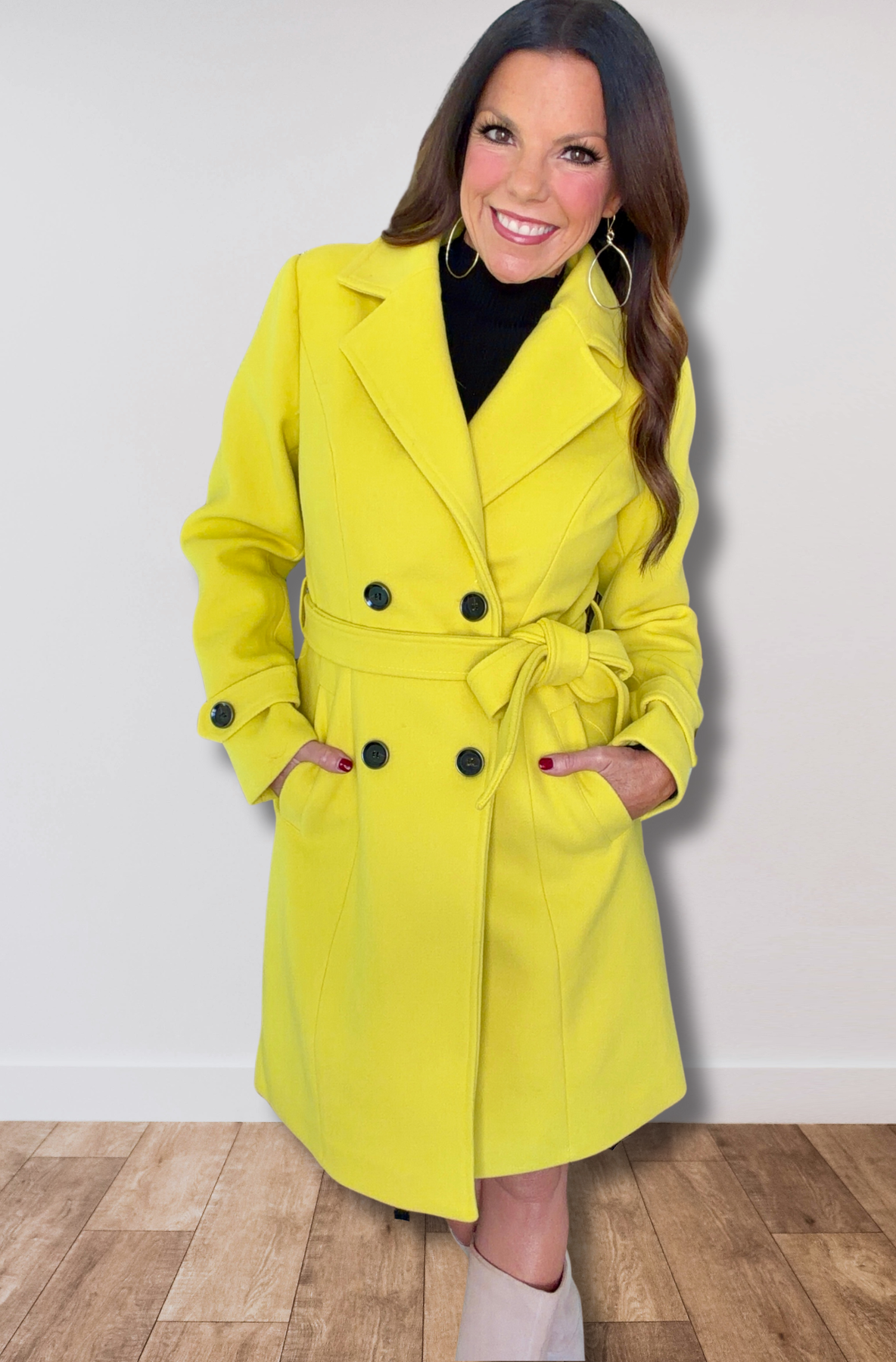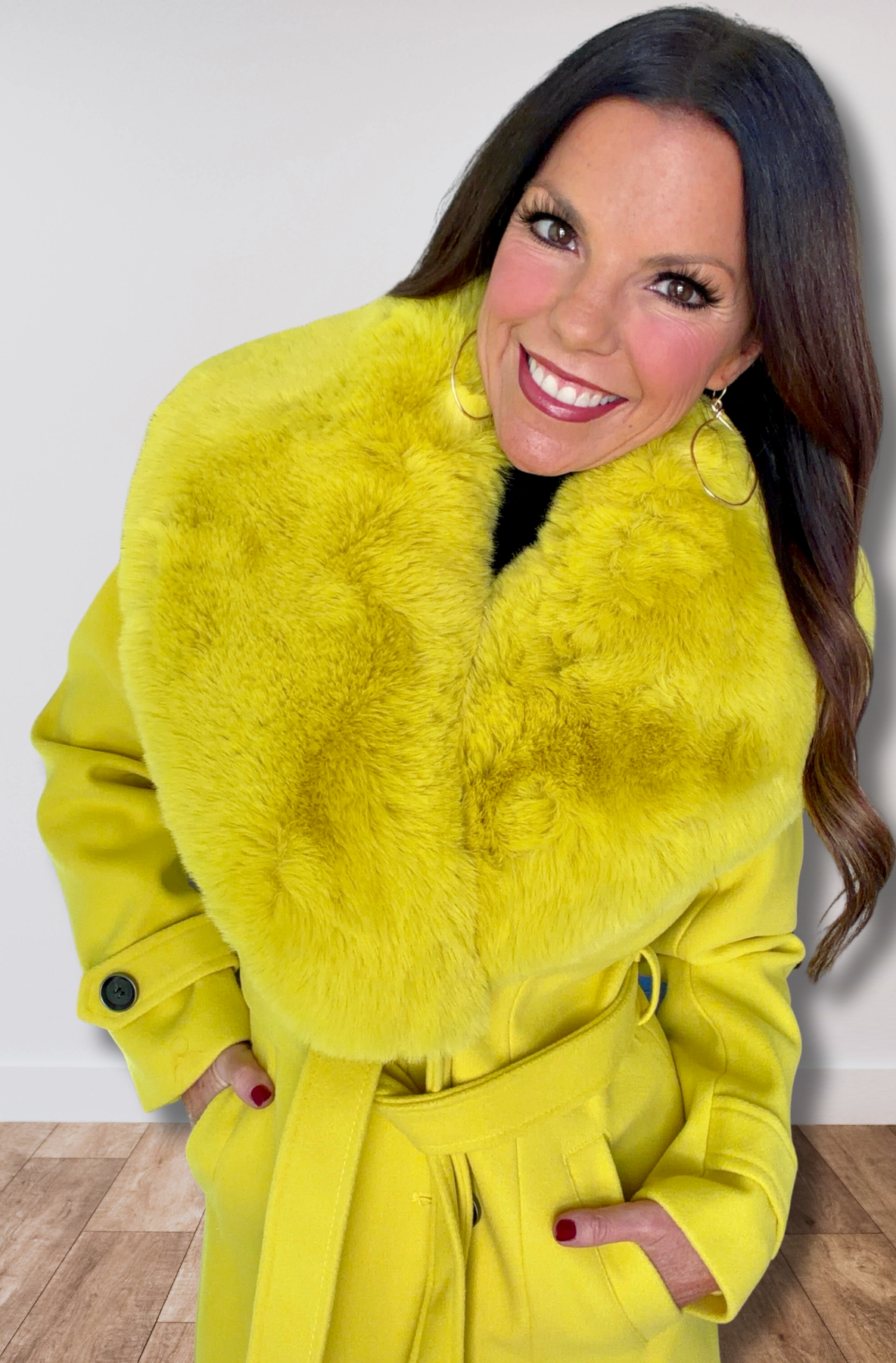 Make a bold statement in our "Citrus Solstice" coat, a vibrant showstopper designed to brighten the coldest winter days. This luxurious mid-length coat features a dramatic oversized faux fur collar that creates an instant focal point, while the flattering wrap silhouette cinches at the waist with a coordinating belt. The double-breasted front with contrasting black buttons adds classic tailoring elements to this contemporary piece.