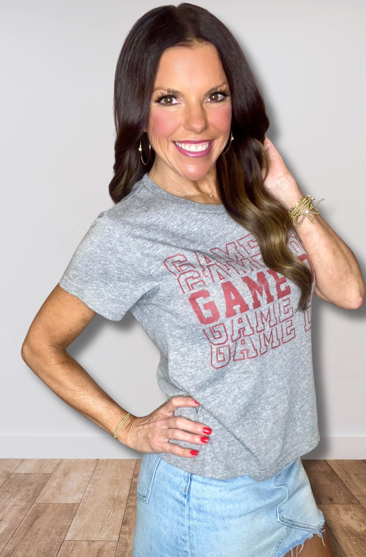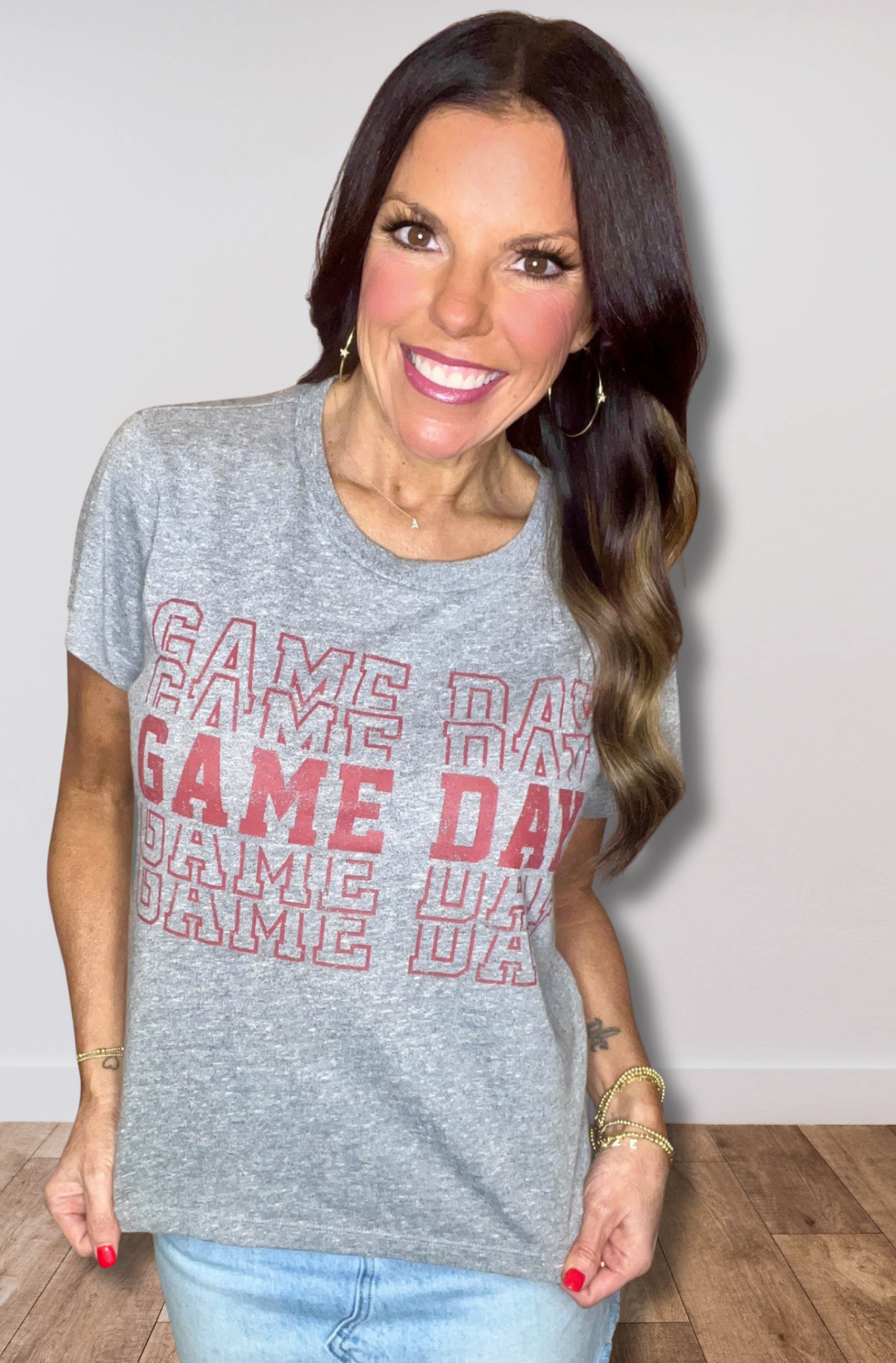 The Game Day Tee brings relaxed athletic energy in soft gray tri-blend cotton with bold maroon lettering.
