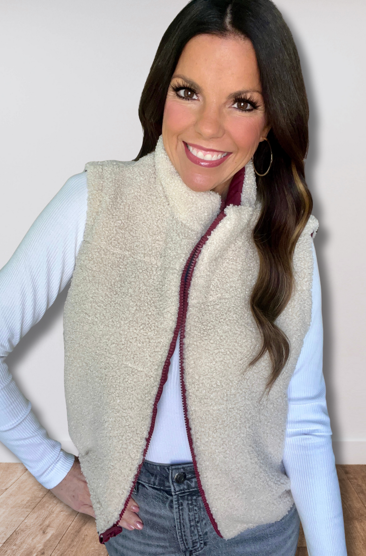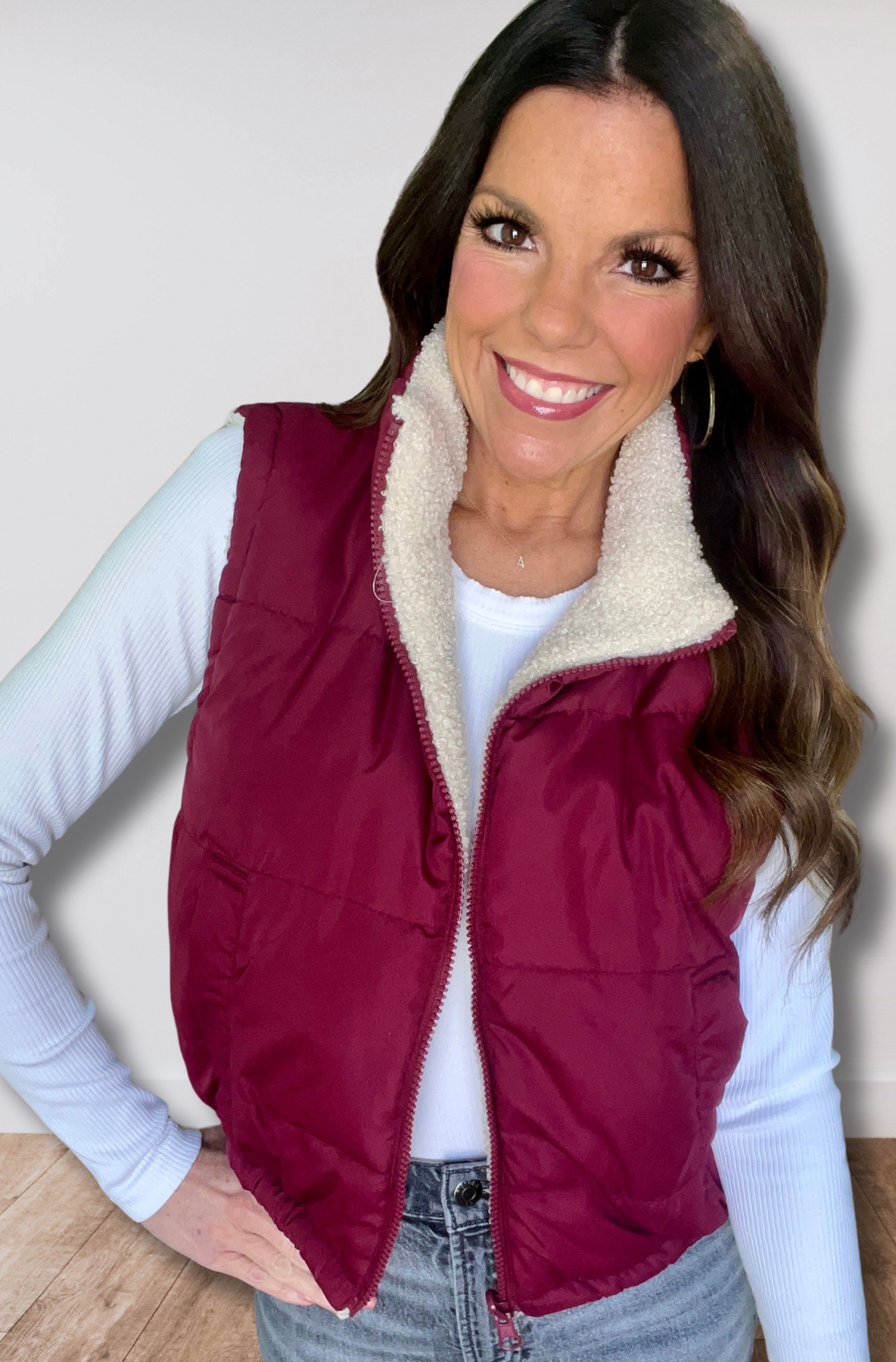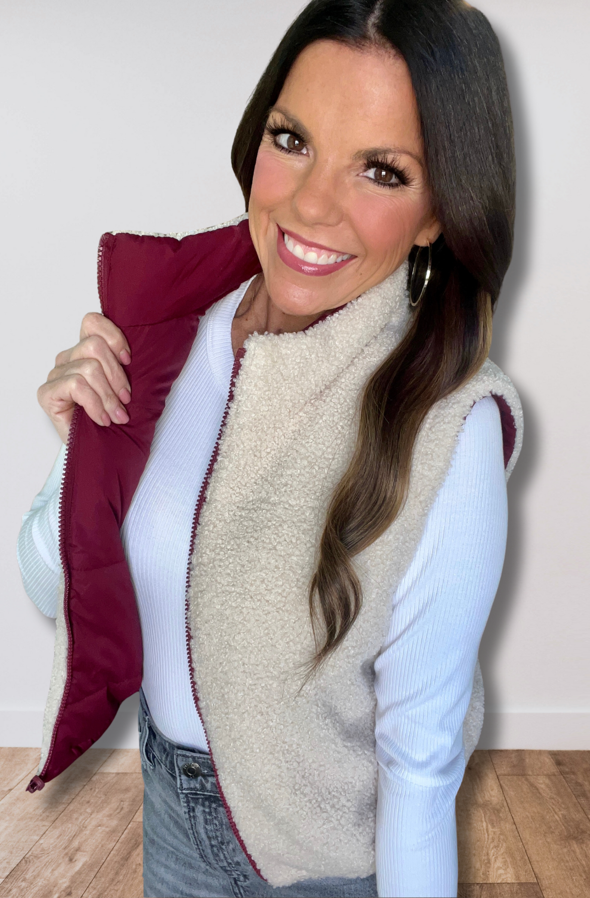 Double the style, double the cozy. The Inside Out Reversible Fur Padded Vest gives you two chic looks in one!  One side features plush faux fur for a luxe, cozy vibe, while the other offers a sleek padded finish for a more casual, sporty look. Perfect for layering through chilly days, this versatile vest keeps you warm without sacrificing style.