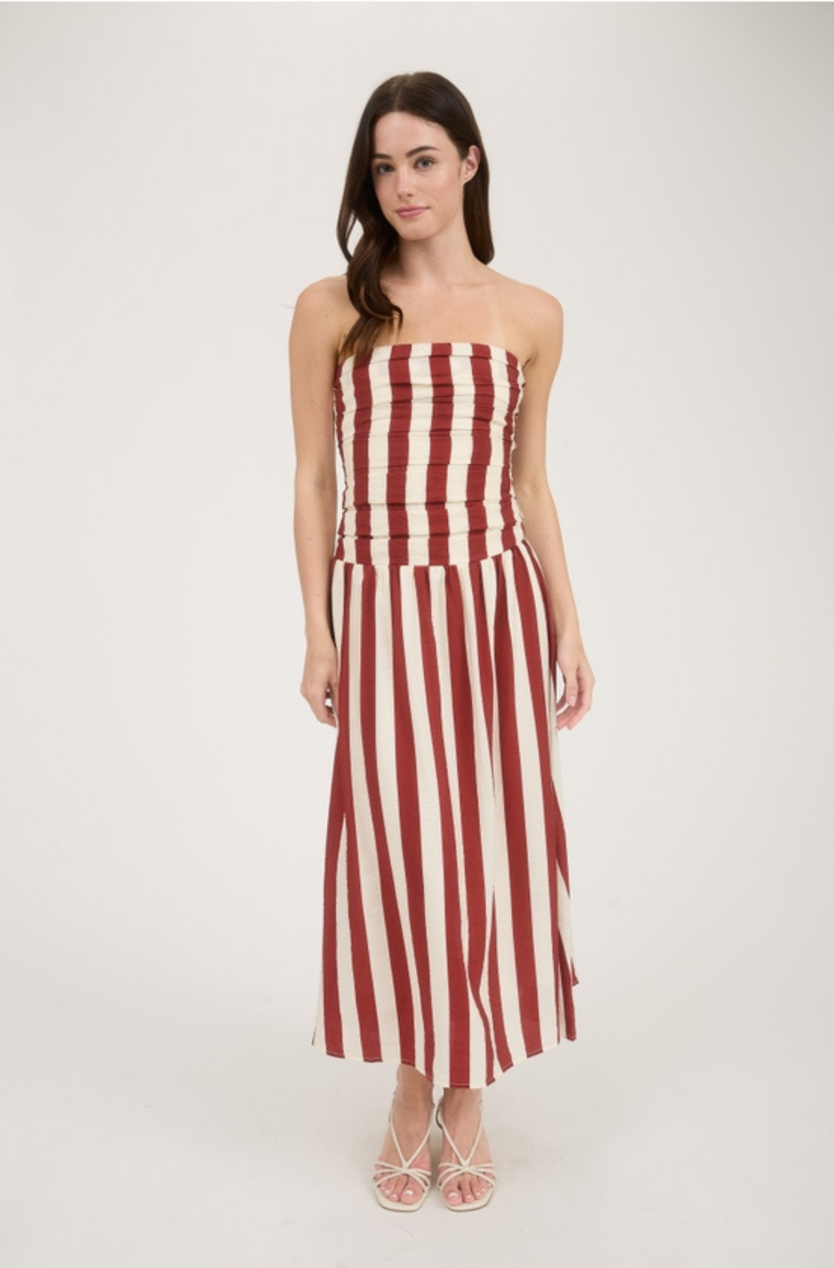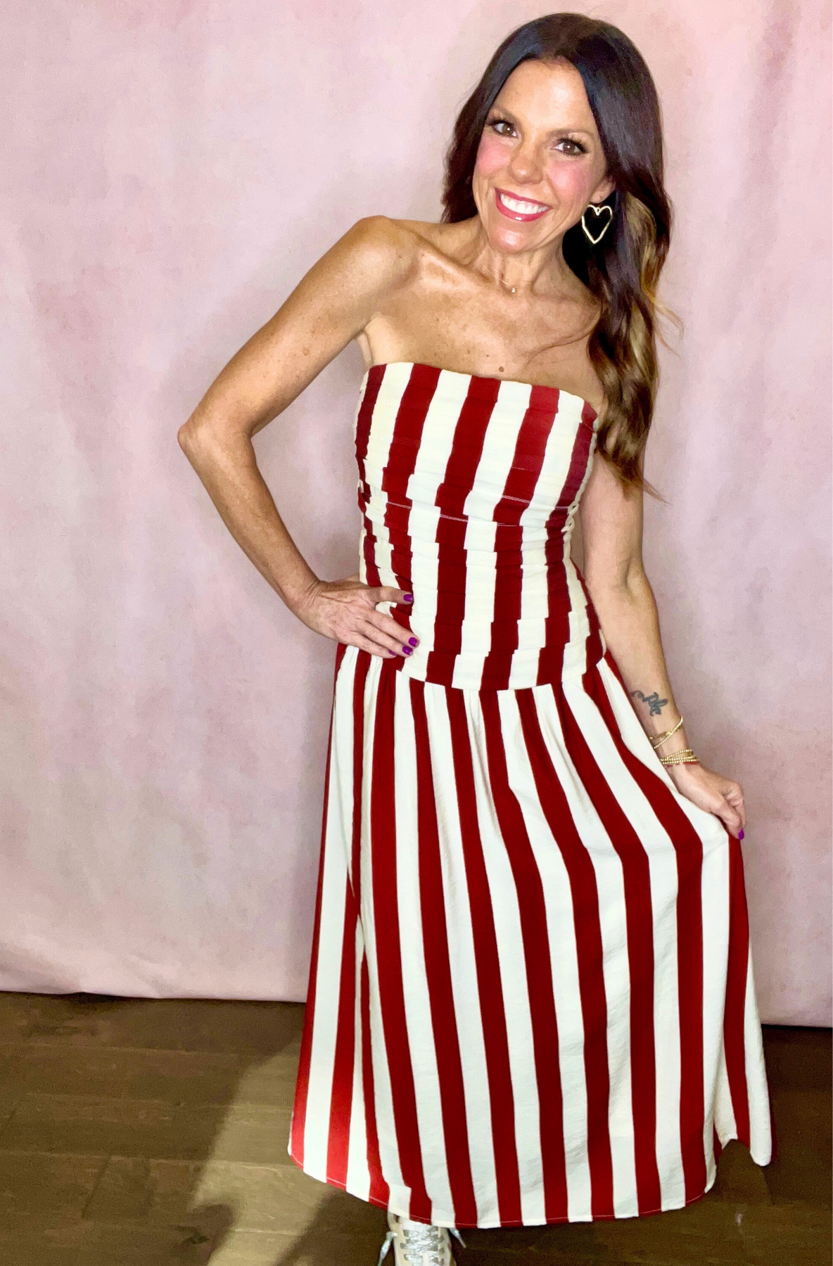 Effortlessly chic with a playful twist, the Saturday Stripes Strapless Midi Dress is your go-to for warm days and breezy nights. Designed with bold stripes that flatter every angle, this strapless silhouette hugs in just the right places for a sleek yet comfortable fit. A slip-on style with no zipper, it keeps things simple and easy while still feeling elevated.