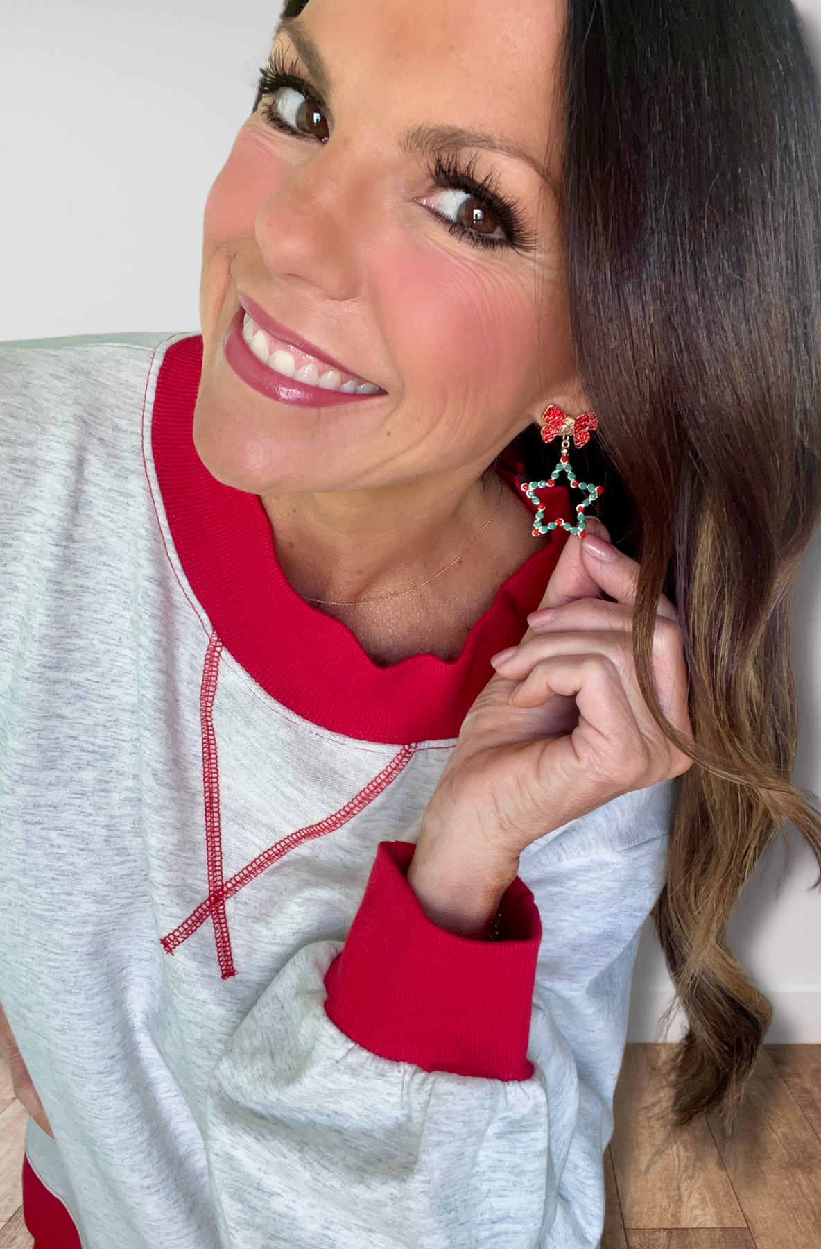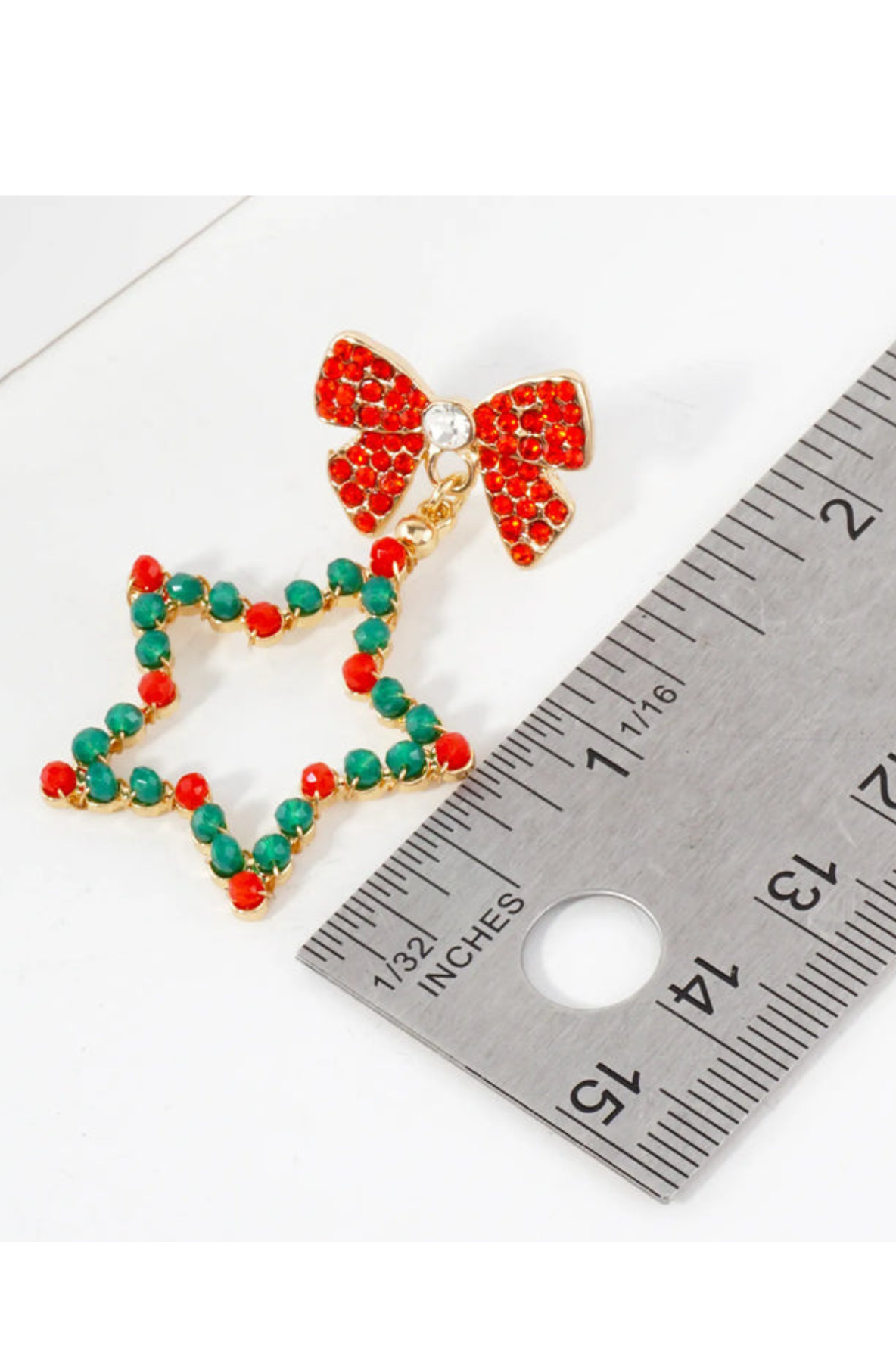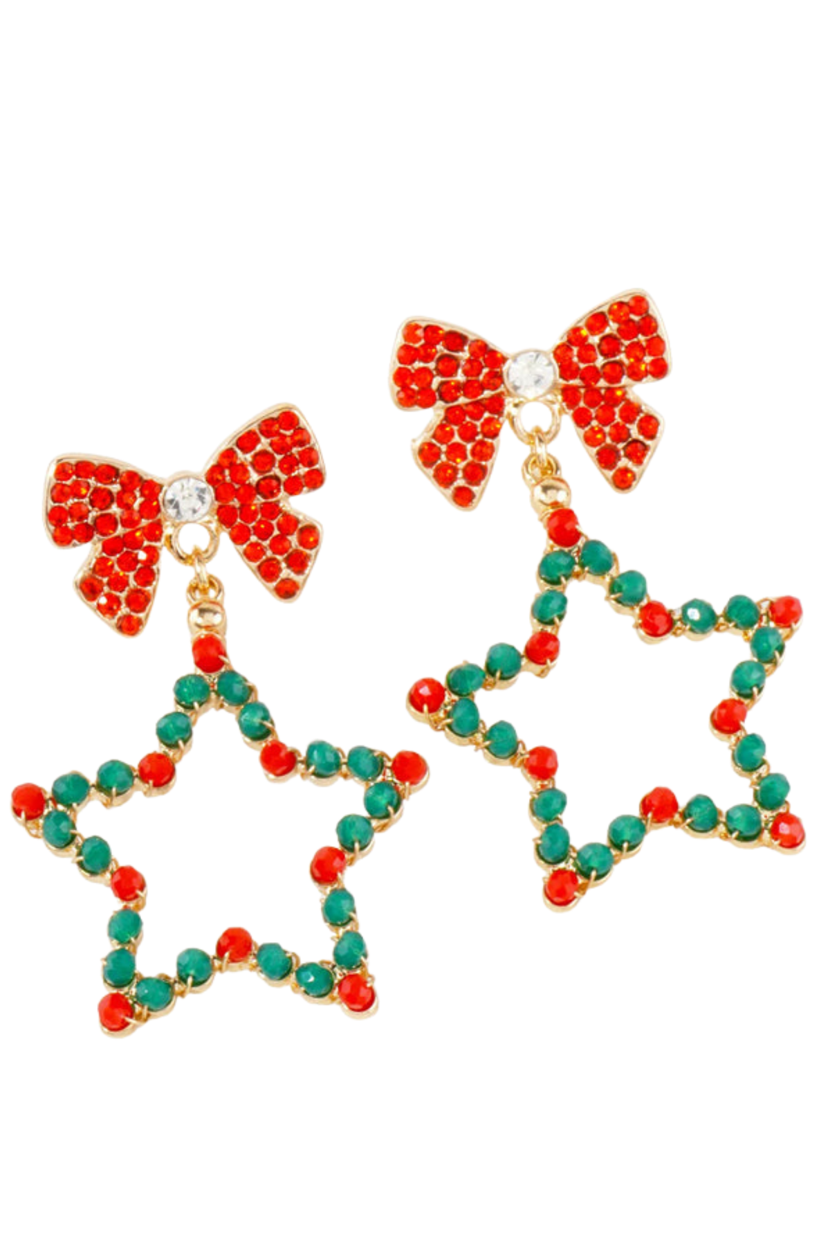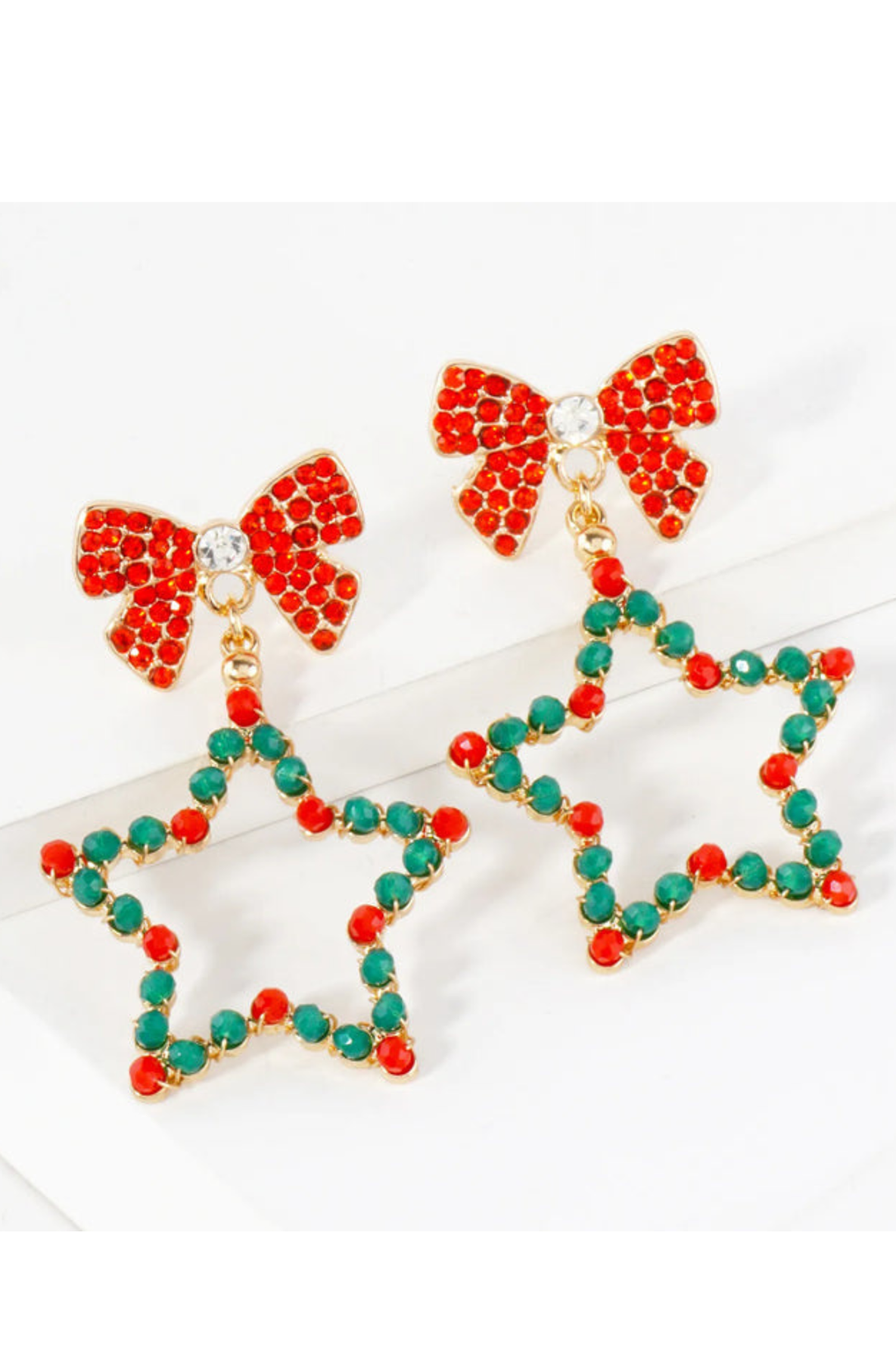 Shine bright this season with the Starstruck Christmas Earrings. These whimsical yet elegant drops feature a delicate glass-beaded star charm suspended from a sparkling crystal pavé bow. Each pair catches the light beautifully, adding movement, shimmer, and a touch of festive magic to any holiday look.