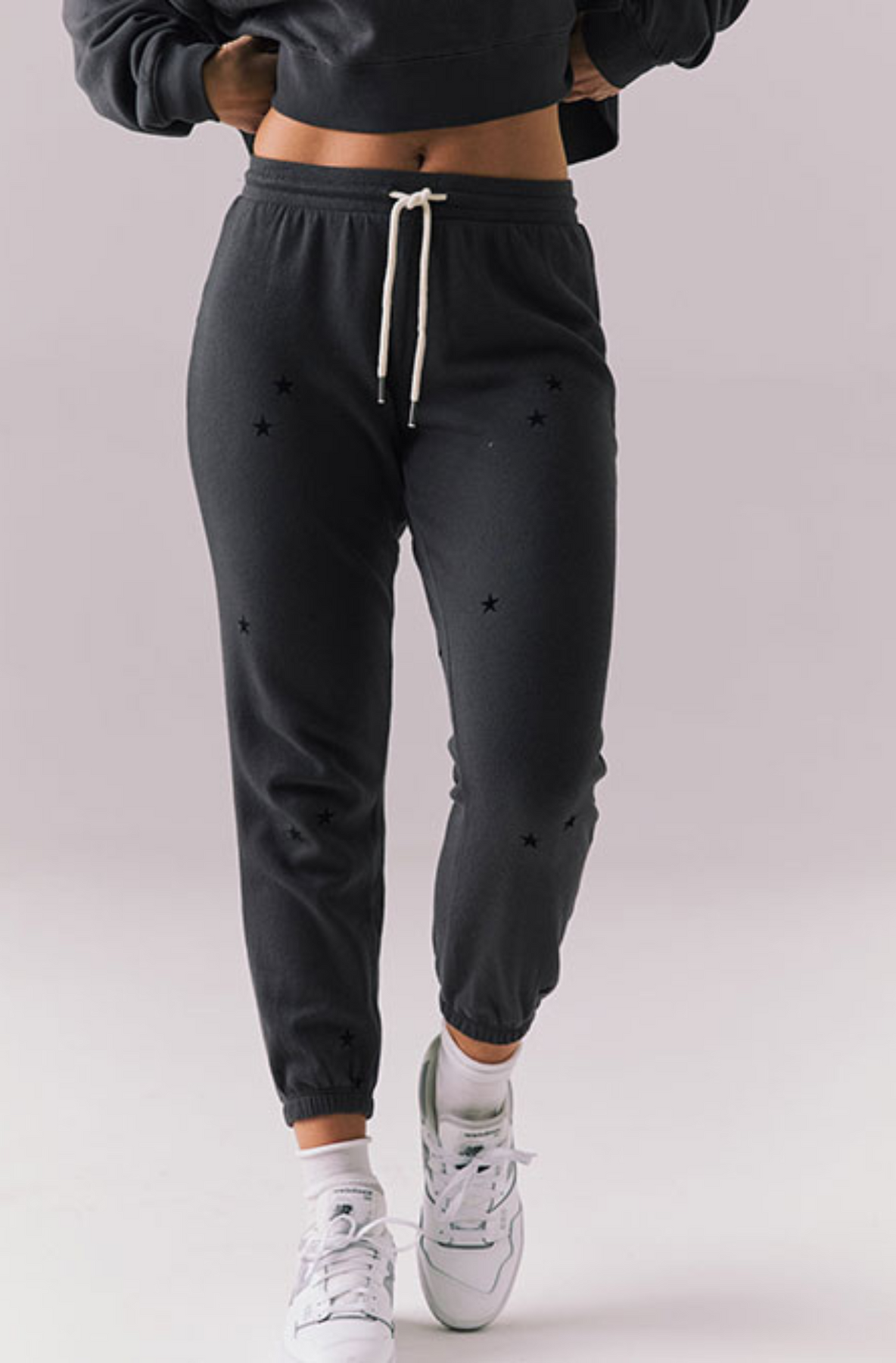 The Allover Mini Stars Pants offer a fresh take on classic joggers with roomy legs and an adjustable elastic waistband featuring a functional tie.