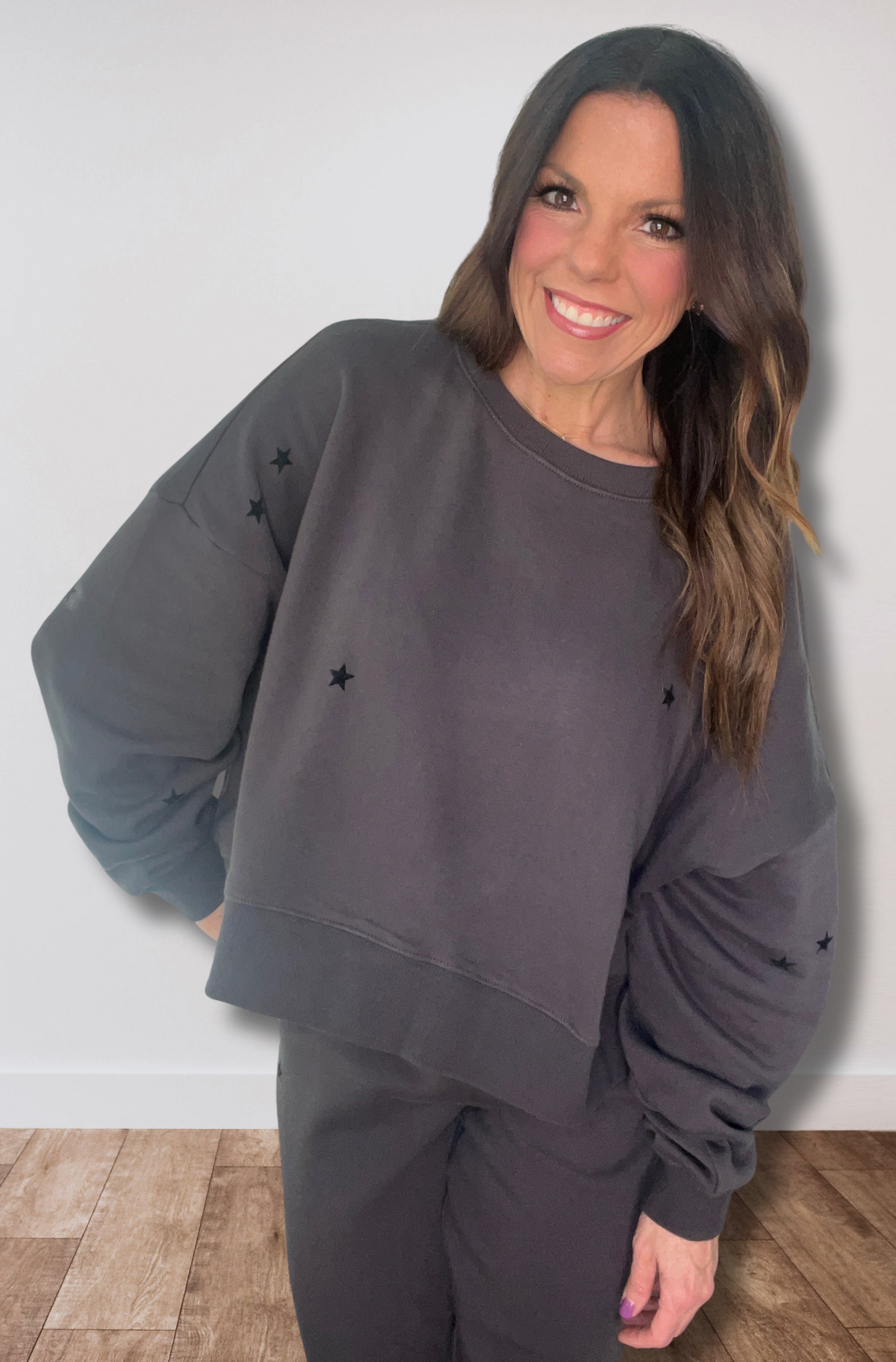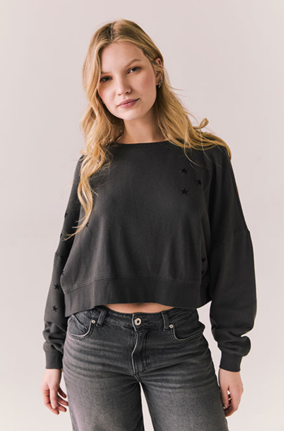 The Allover Mini Stars Long Sleeve features a petite star motif on a flattering, slightly cropped silhouette.