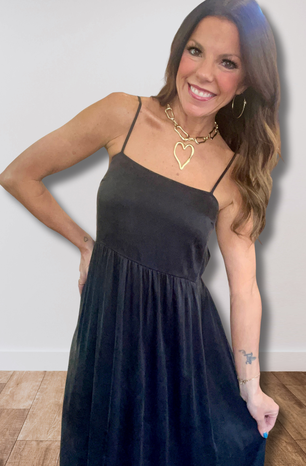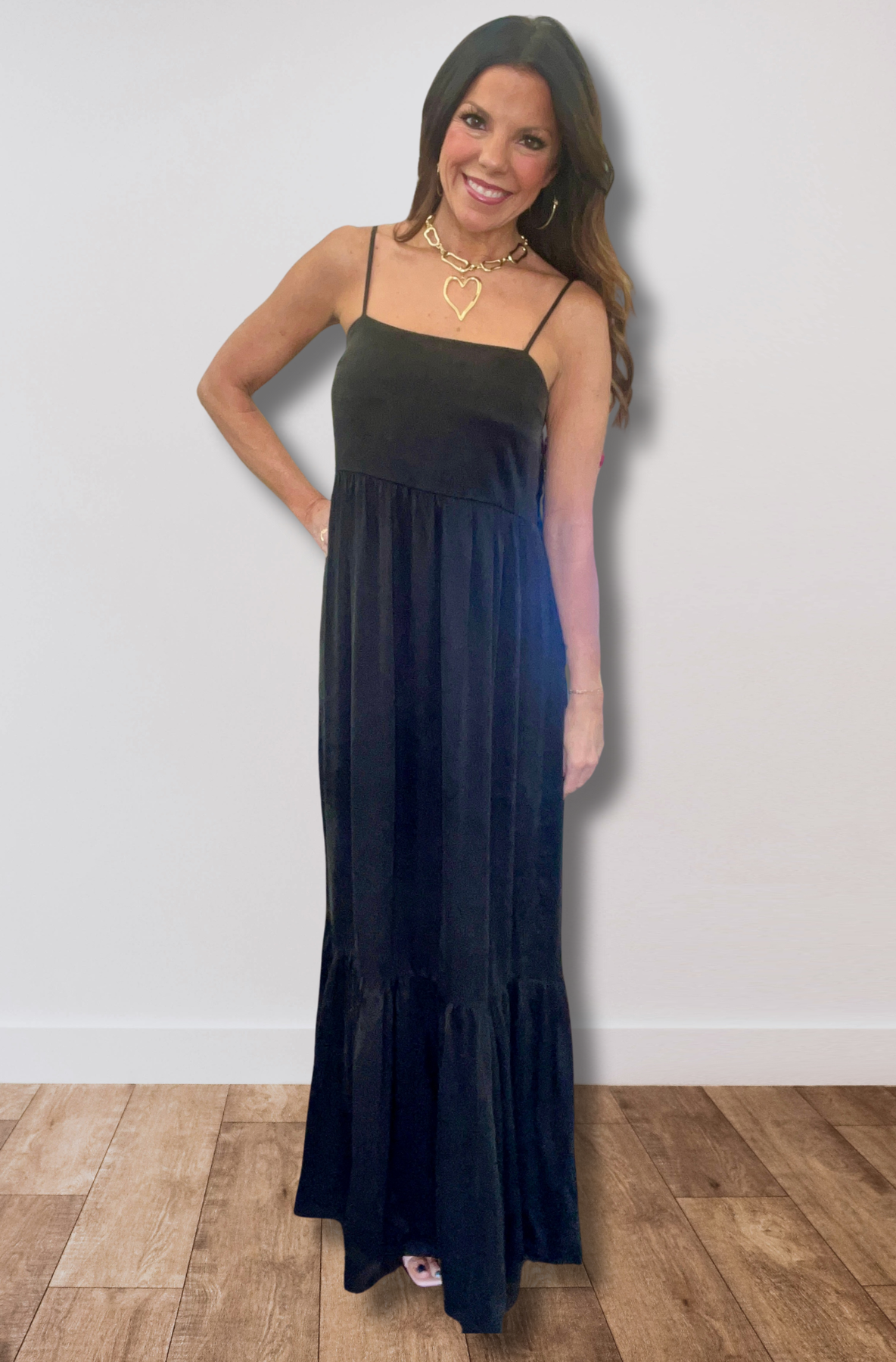 This true black maxi dress flows with soft twill movement and a clean-lined silhouette that hugs just enough.