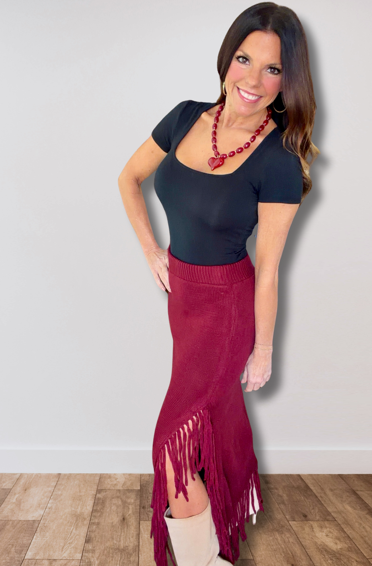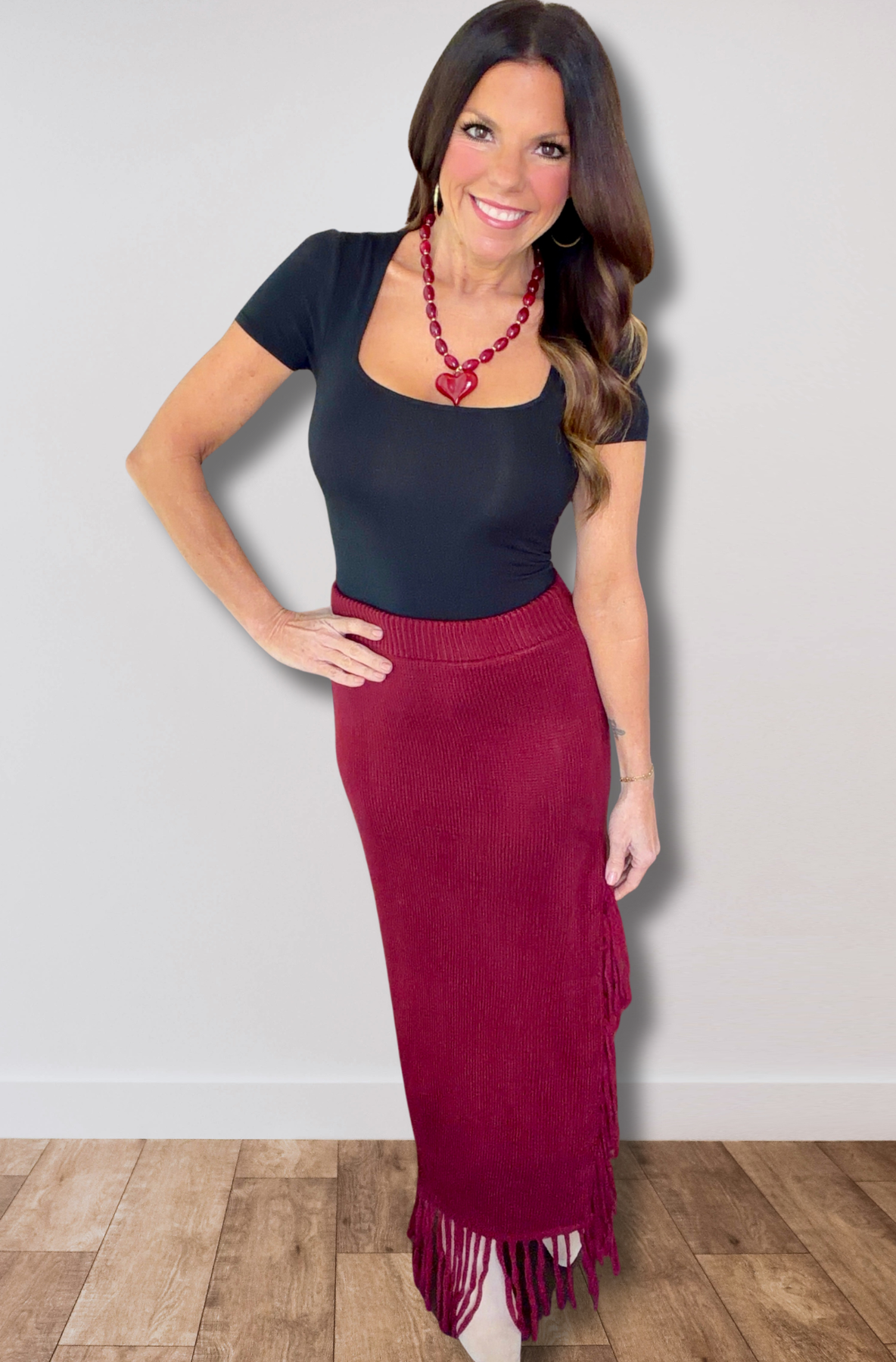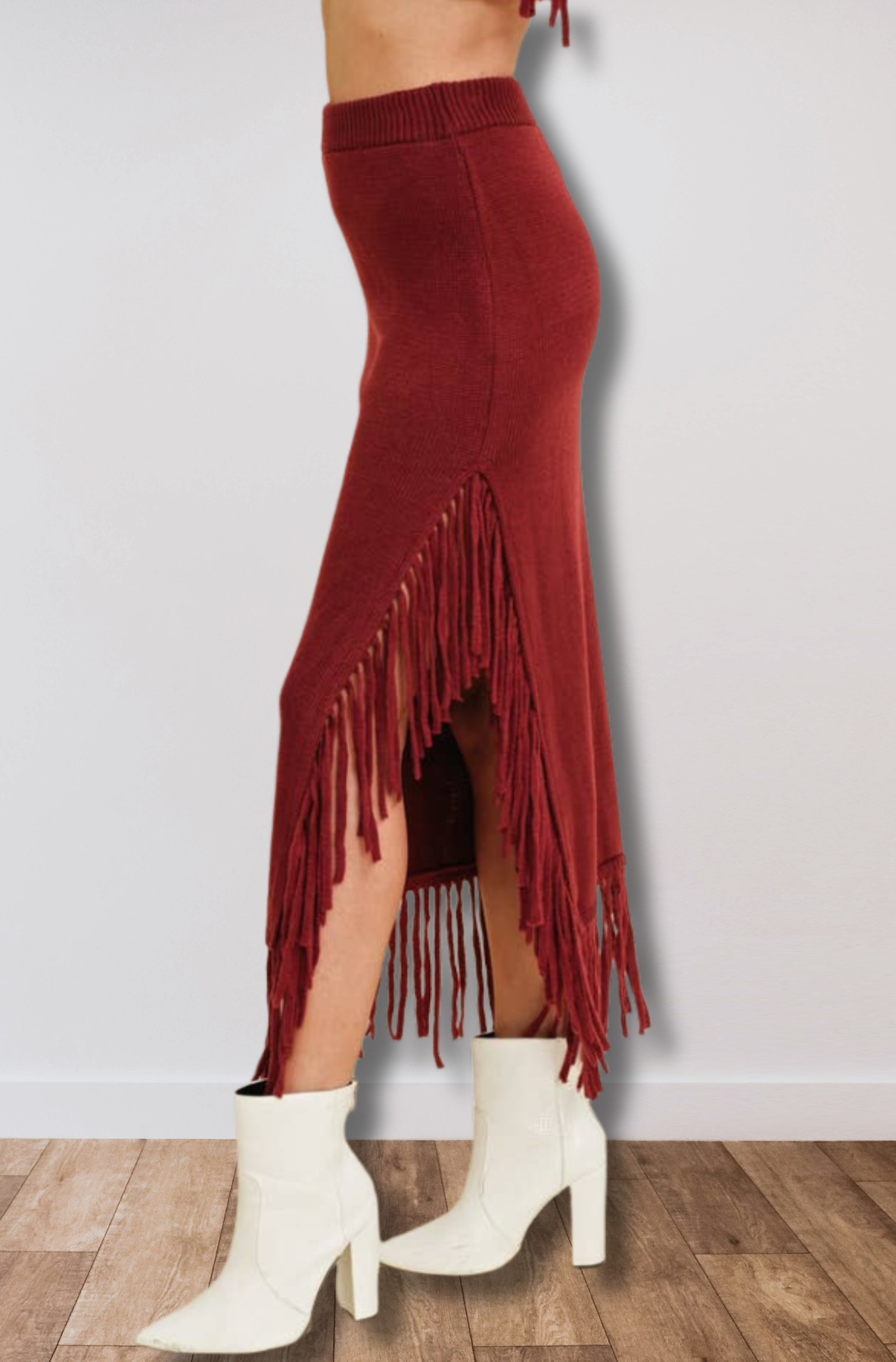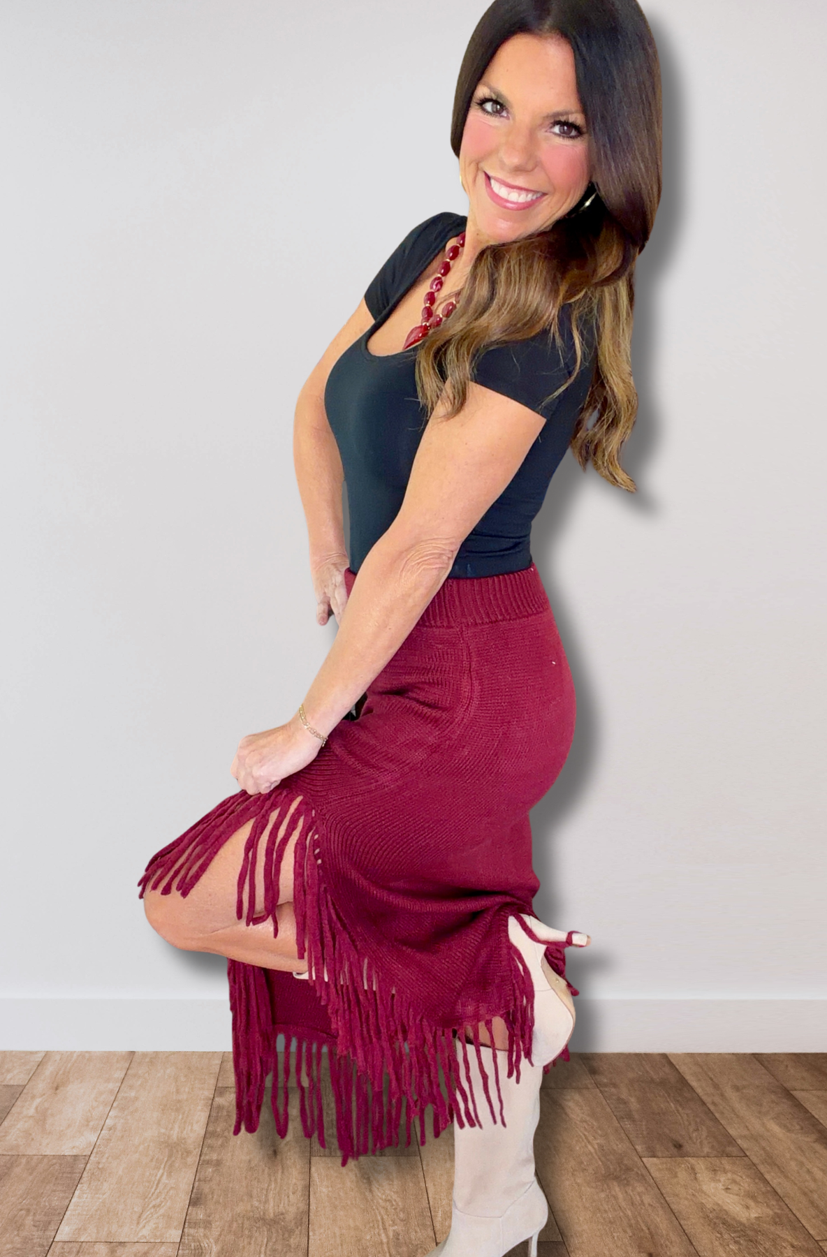 Step out in style with the Edgeline Fringe Midi. This high-waisted knit skirt features a daring slit and playful fringe detailing, creating movement and flair with every step. Designed to flatter your silhouette while keeping a modern, edgy edge, it’s perfect for game days, date nights, weekend outings, or any occasion where you want to turn heads.