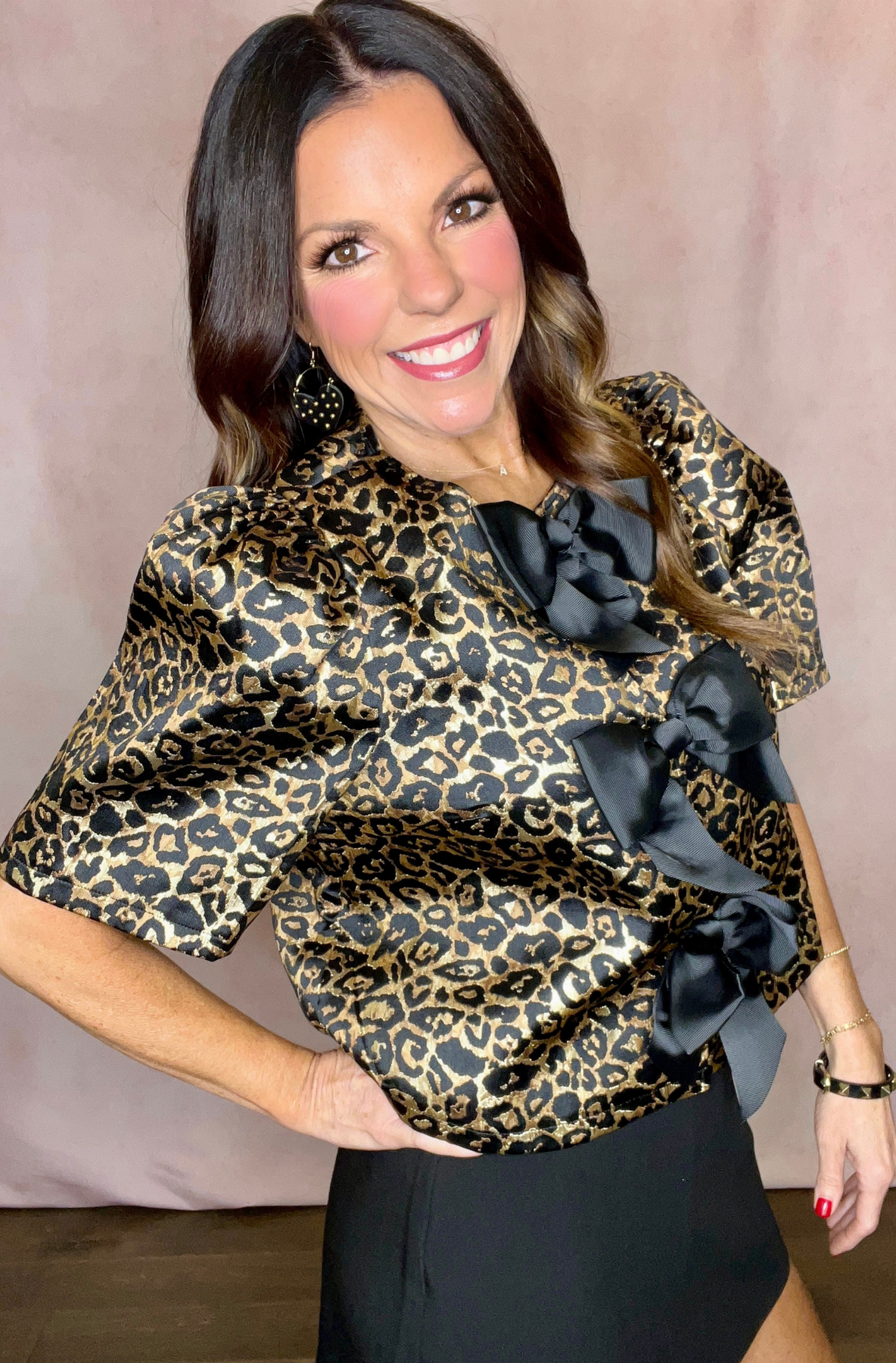 Regular price $59.00Flirty meets fierce in the Leopard Kiss Top. This leopard jacquard blouse features short puff sleeves and a front snap button closure, finished with three sweet bow details for the perfect girly touch. Dress it up with a skirt or keep it casual with denim, either way, it’s a wild little statement.
