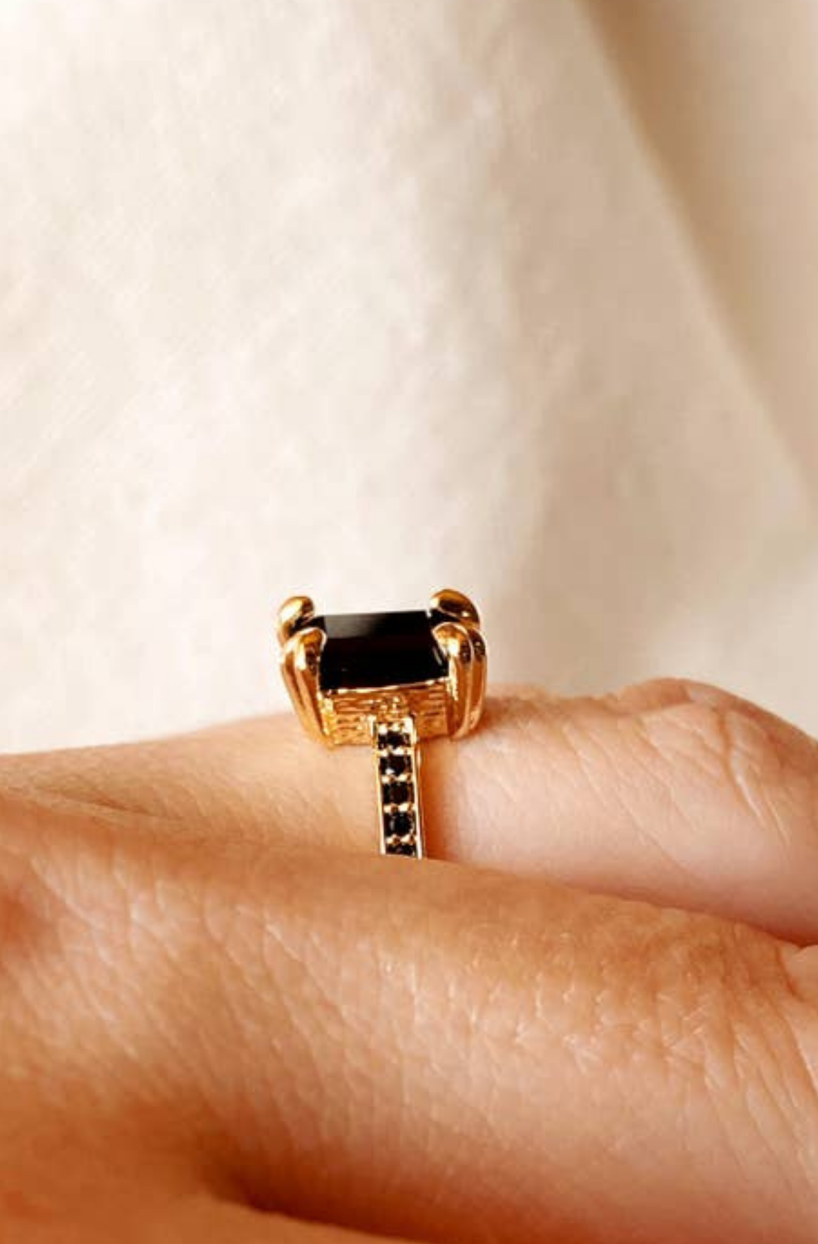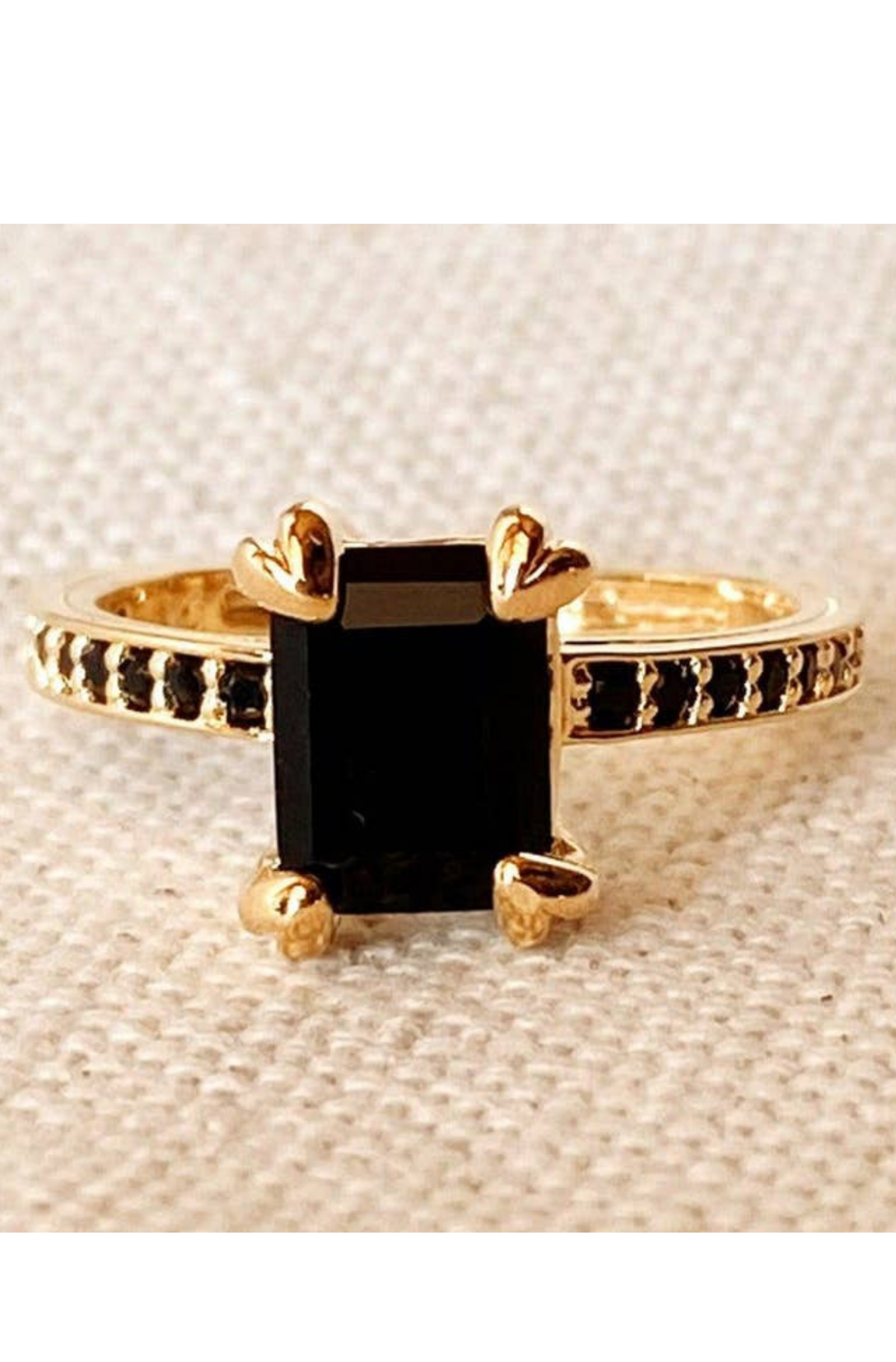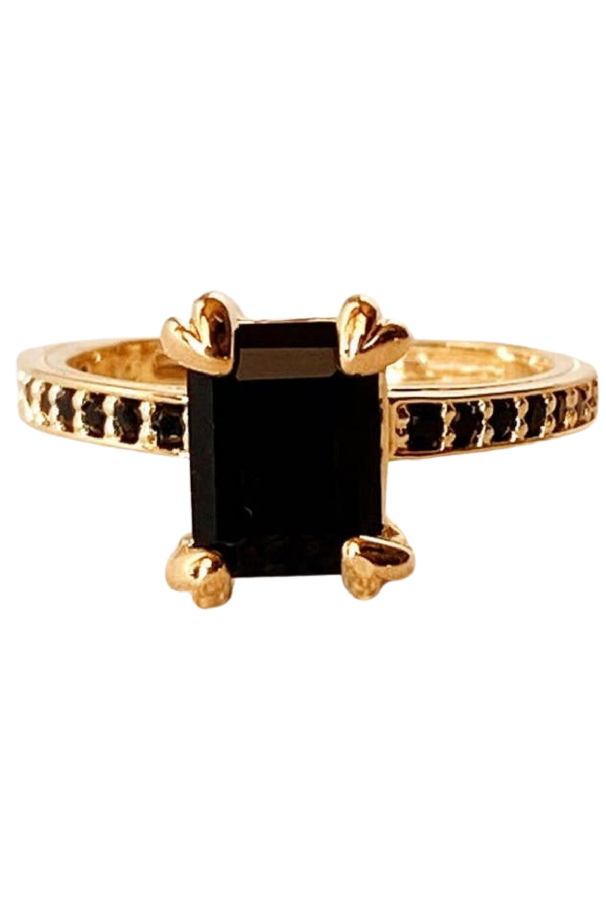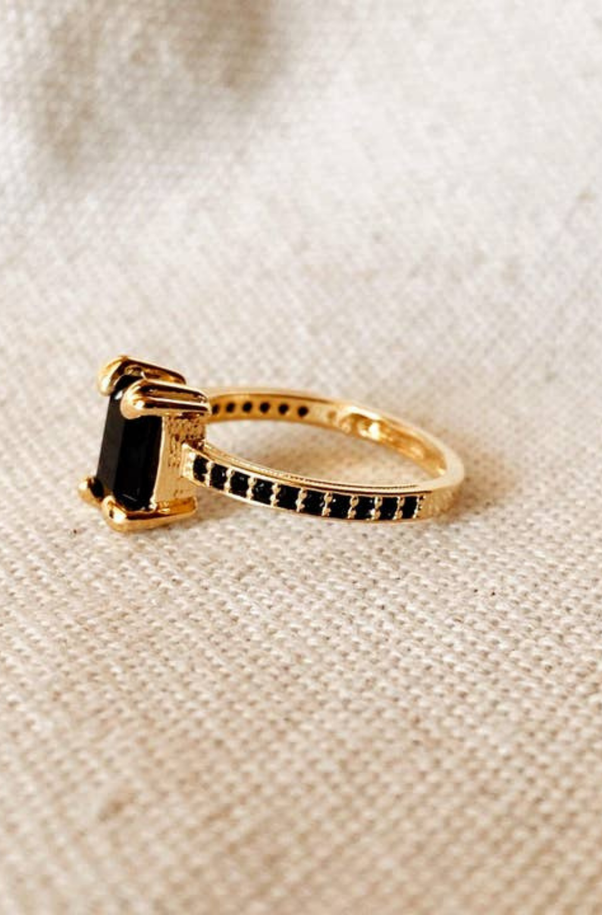 Make a bold impression with this 18k gold-filled solitaire ring, designed to stand out. Featuring a striking rectangular black cubic zirconia stone (5 x 10 mm), the center is framed by delicate micro pavé CZ accents on each side for added sparkle. Sleek, modern, and effortlessly luxe, this statement ring is perfect for elevating both everyday looks and special-occasion outfits.
