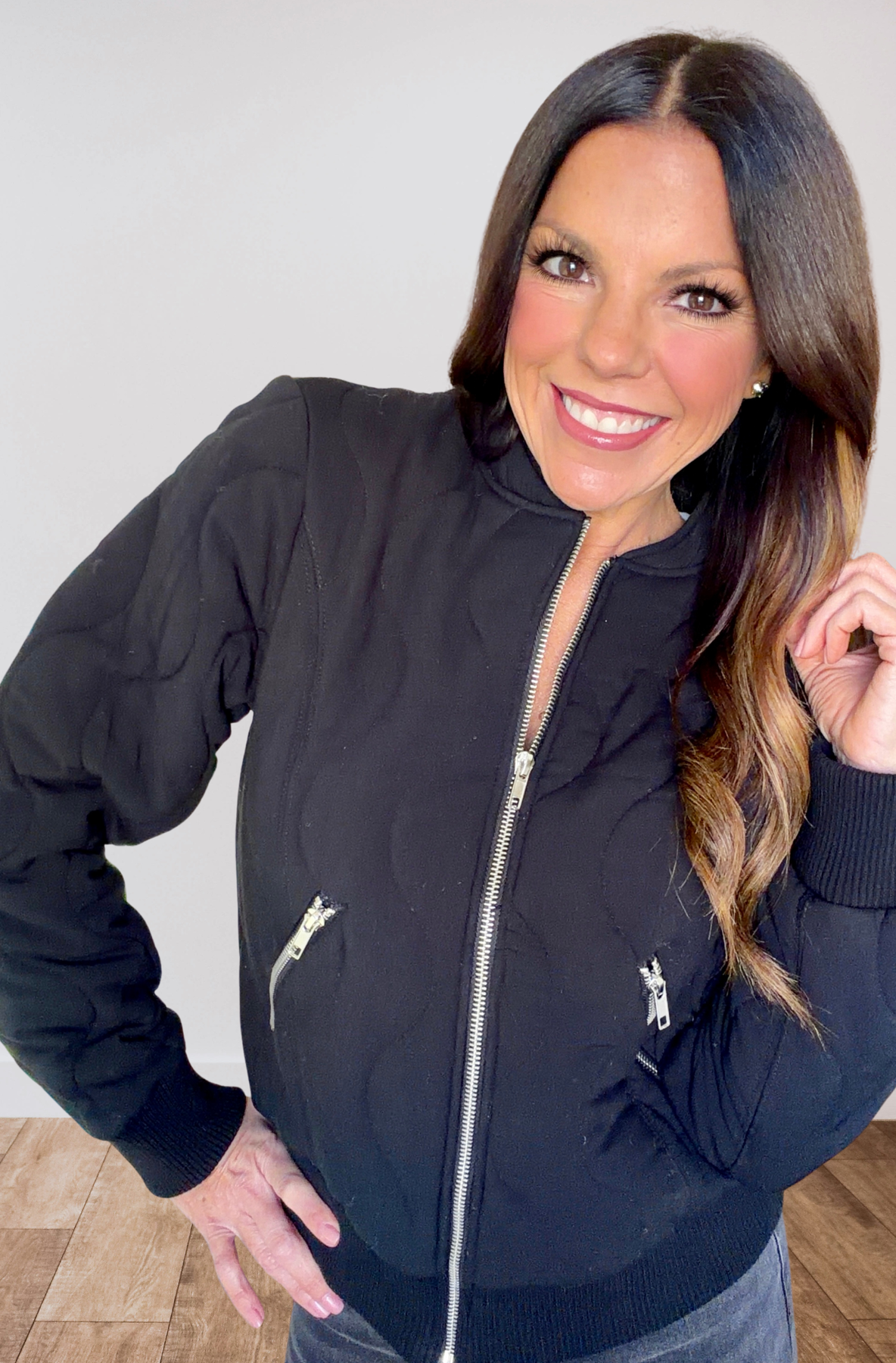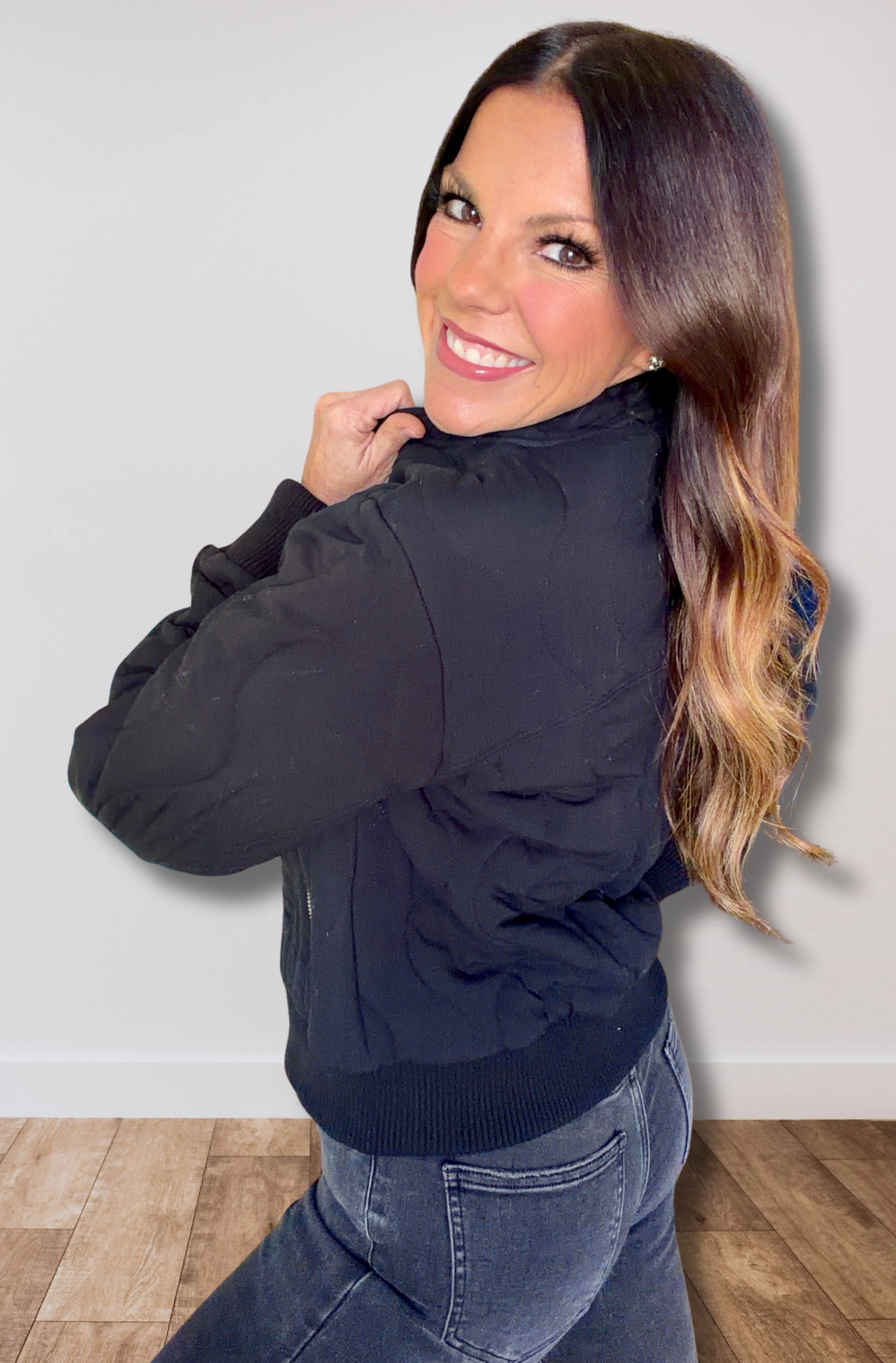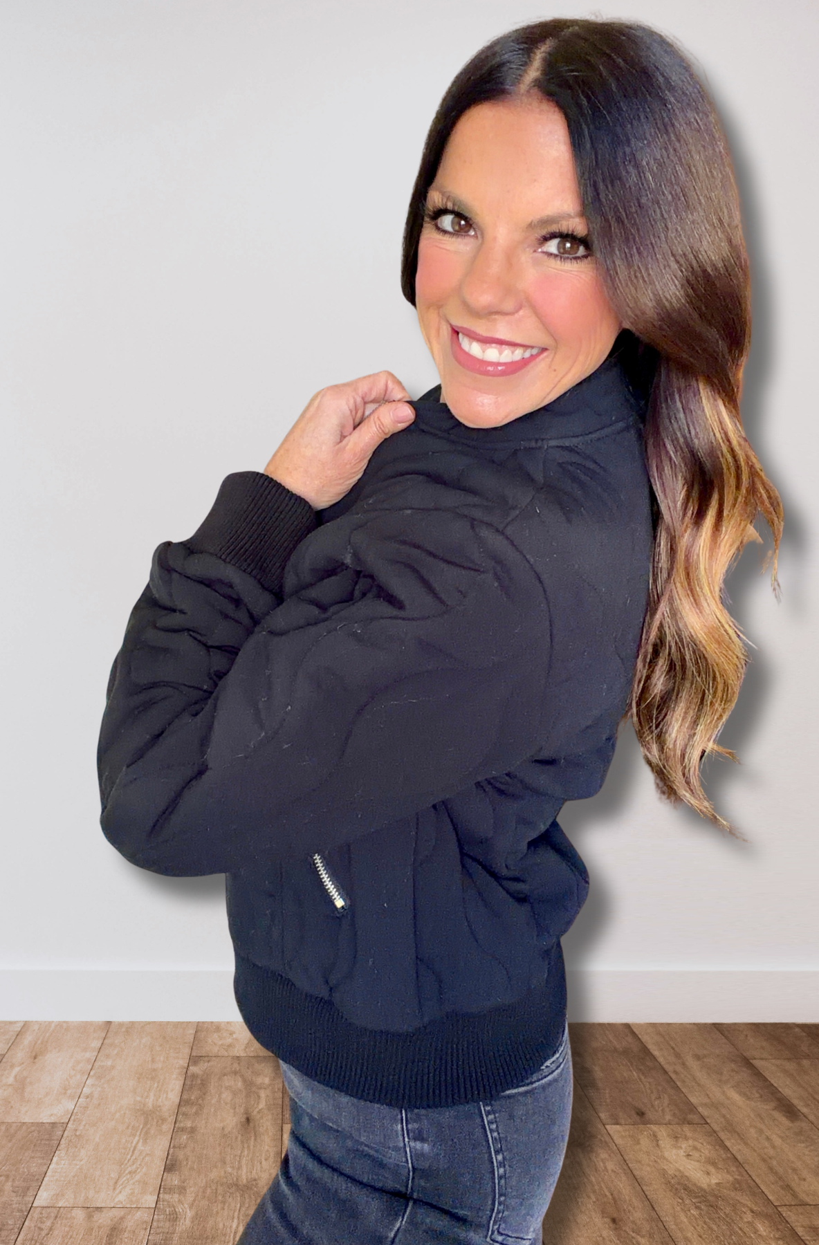 This quilted, cropped mock-neck puffer jacket features serious style and some stretch.