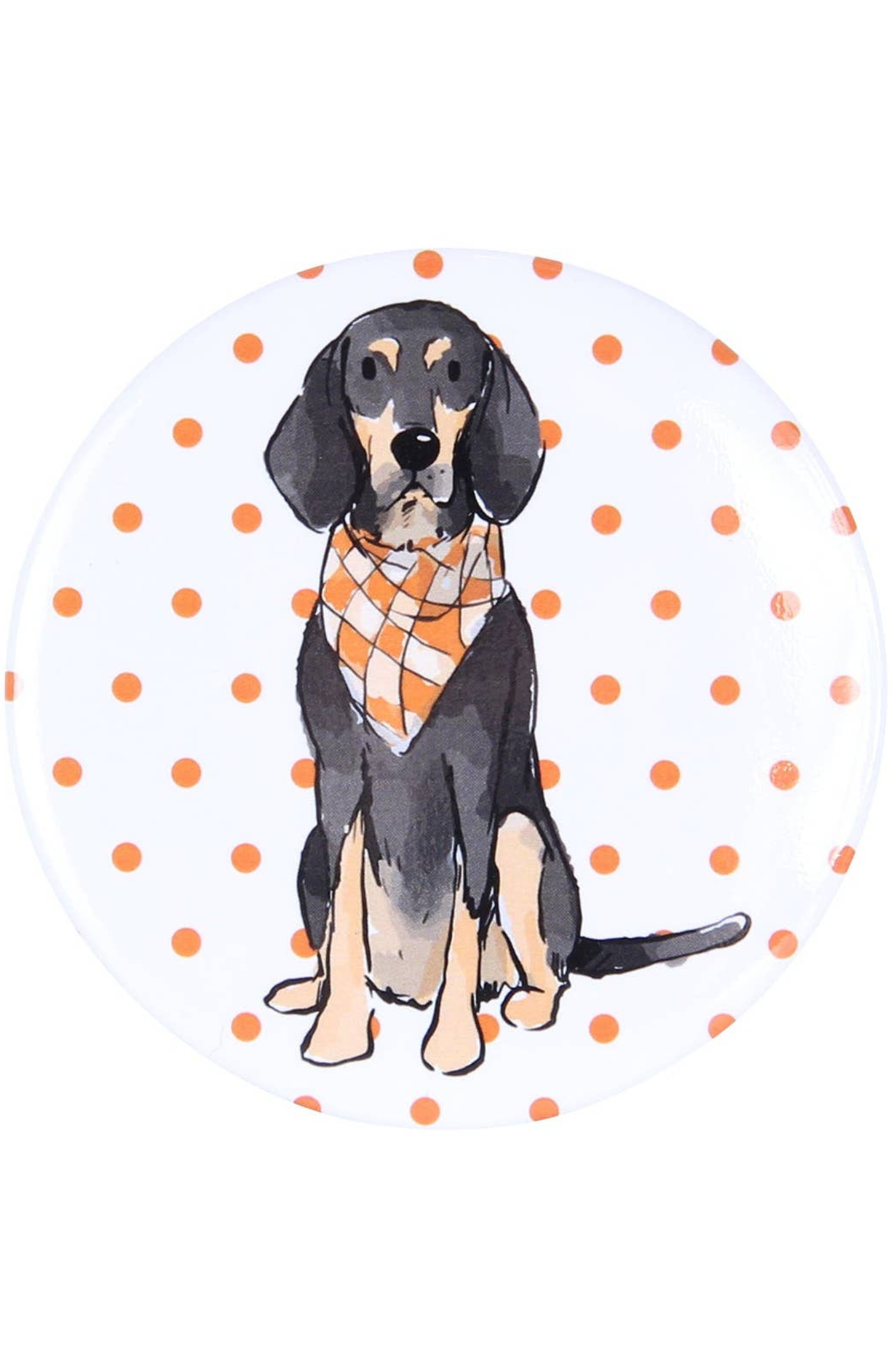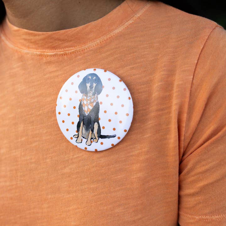 Regular price $7.00Show off your team spirit with the Sitting Bluetick Coonhound Polka Dot Button Pin! This fun little accessory brings the perfect pop of pattern to your gameday look. Whether you’re heading to the tailgate, the stadium, or a watch party with friends, it’s an easy way to add some playful Tennessee pride to your outfit and stand out in the sea of orange and white.