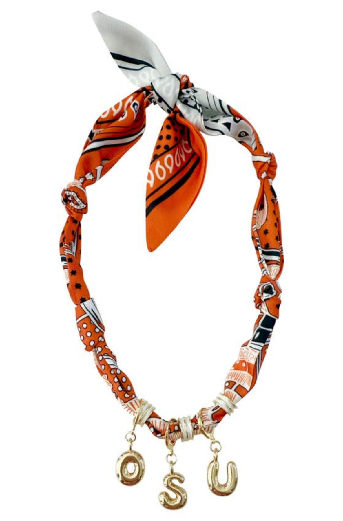 This one comes in an orange and black printed scarf with gold bubble letters reading "OSU". We love it for Oklahoma State Gameday!
