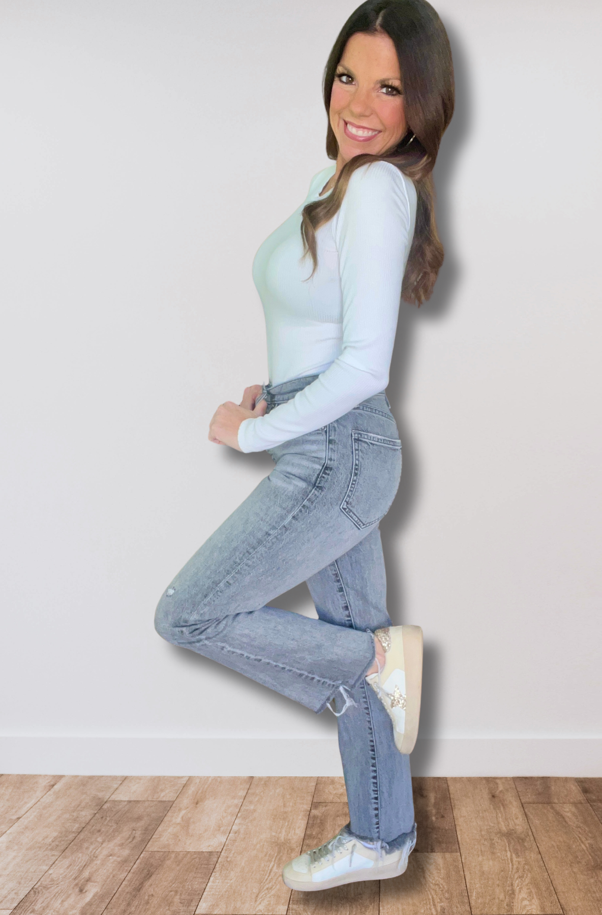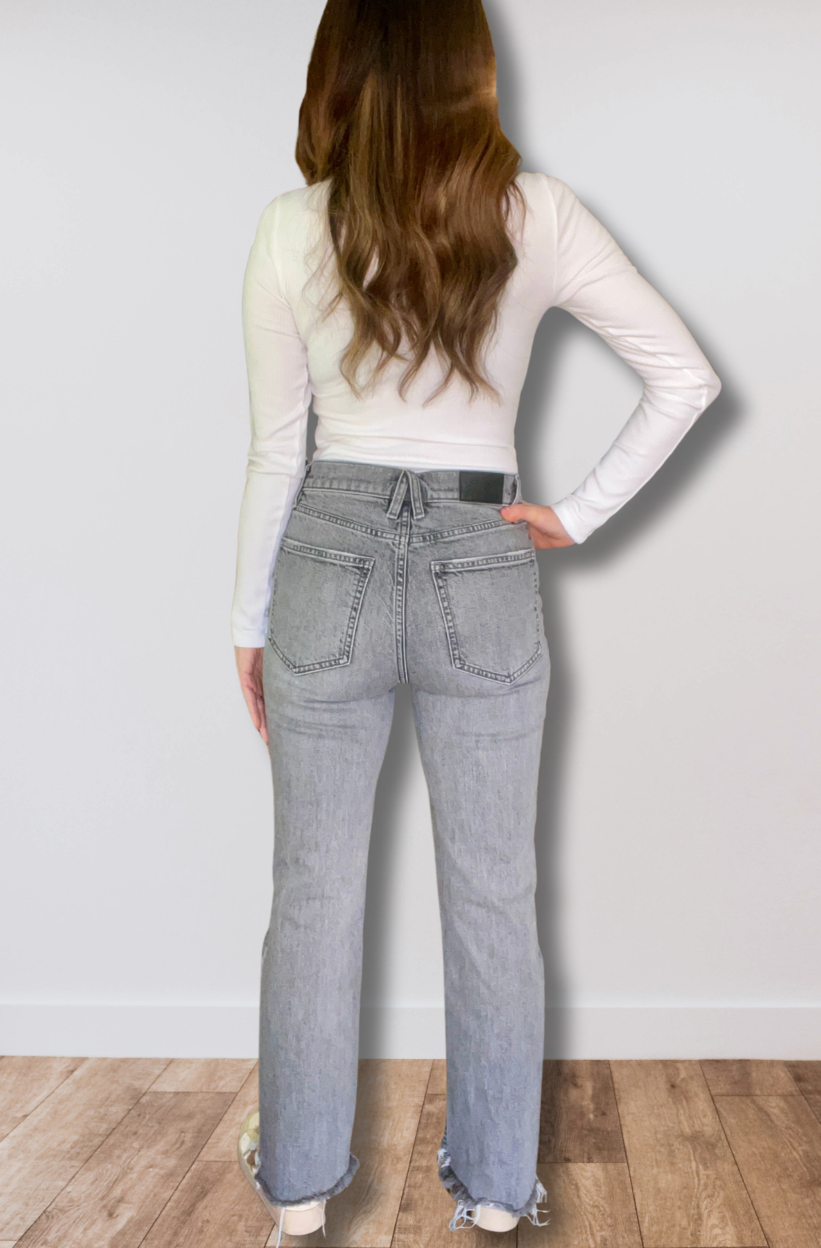 An updated take on a bootcut jean, the Ally High Rise Ankle Boot from Pistola Denim features a slightly wider leg than the traditional fit while still having the signature flare at the calves. In a vintage comfort stretch fabric, the jean will keep its structure and give you just a touch of comfortable give. Wear this whiskered, stylish gray wash with a chunky sweater and heels or a bodysuit and boots.